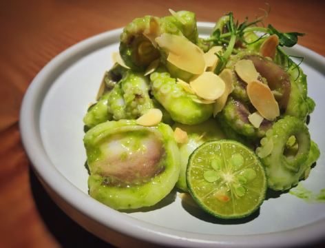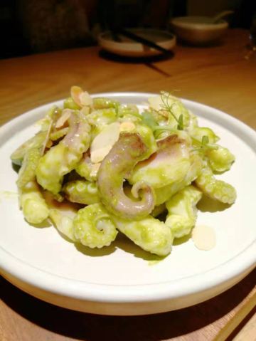 一直在路上的猫独栋别墅|时宜料理|生活需要仪式感; 各种节日,纪念日,特别的日子,总想找个环境典雅,浪漫独特一点的餐厅,给彼此的记忆烙个印。 被带来半未时宜料理,位于厦门莲花凌香路凌香里16号别墅,独栋别墅,高档大气,暖色调灯光使人放松,忘却烦恼,莫名的心情愉悦。 主打创新闽菜,即在保留闽菜精髓的基础上,开发特色的新口味菜色;基本上每一道菜从色香味上都给我惊喜; #葱香椒麻汁八爪鱼# 开胃凉菜,清新的绿色让人心旷神怡,先从视觉上享受了美食,一定是精选品质优的八爪鱼才能如此脆嫩,杏仁片的加入点睛之笔,第一次吃到如此特别的八爪鱼,推荐一定要点; #不太正宗的沙茶豆花煮肥牛# 肥牛片肥瘦相间,沙茶汤甜和辣度调配的恰到好处,一开始以为是豆腐,吃到嘴巴里才感觉到是加了鸡蛋的豆腐,看菜名才知道是豆花,浸泡吸收了沙茶汤汁,入口即化,嫩滑; #黑松露芦笋尖炒明虾球# 明虾去头去尾只留净虾仁,鲜甜嫩,芦笋清爽甜嫩,这是一道倆鲜嫩结合的菜;珍贵的黑松露让虾仁和芦笋的口感更加丰富多彩; #半未泡椒酸辣田鸡# 相比较其他菜,这道算是比较重口味了,田鸡肉质紧实,里面的笋片特别好吃,虽说是泡椒,竟然可以做到菜入味酸辣,汤却鲜美可以直接喝,酸辣开胃; #蒜焗黄花鱼# 之前在其他家也吃过类似的菜,区别就是选用的黄花鱼非常新鲜,蒜也是颗颗饱满,鱼肉入口鲜嫩; 生活还是需要点仪式感的,在这样的环境品如此美味必须难以忘怀,宴请朋友客户或者聚餐也特别有格调。