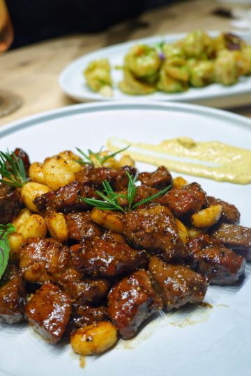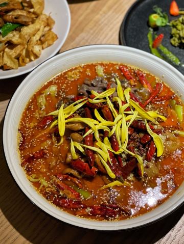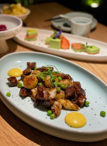 大胖在路上宴南庭·寻季山海 菡青路这里居然藏了一家人均近200元的私房菜!?路过无数次都蠢蠢欲动,今天终于约上小伙伴“盘他”了 开胃菜 「山楂碰撞牛油果」 这颜值还是很对得起定位的,牛油果慕斯和山楂糕压合,酸酸甜甜,真的是开胃利器了 寻季山海 「金蒜黑椒煎炒雪花和牛肉眼」 和牛肉眼切的超厚实大块,肉质也是鲜嫩到吞舌头,蒜、京葱、黑胡椒都很好的起到了调味的作用,好吃 「酸笋焗炒脆皮肥肠」 这是什么神仙料理?酸臭星人简直欲罢不能,酸笋焗烤到酸香四溢,肥肠很脆,丝毫不腻,我行了 「麻辣水煮三珍」 麻度辣度都挺刚好的,鸭胗、肥肠、金钱肚,将内脏快乐进行到底,真的米饭杀手了 「干贝焗绿蔬豆腐」 蛋豆腐和蔬菜干结合,说不出的鲜美,调味很棒 甜品 「南岛椰子慕斯」 还原了椰子岛屿,切开还有夹心,趣味与美味兼具,口腔又清爽了呢 没想到菜品和甜品都好吃,满意 ————————#信息#———————— 📌地址:菡青路凌香里16号别墅 🍃环境:进门就是一个庭院,很适合下午茶,原木艺素雅的装修,还是很清新时尚的 👩💼服务:服务员面带微笑,态度都挺好的