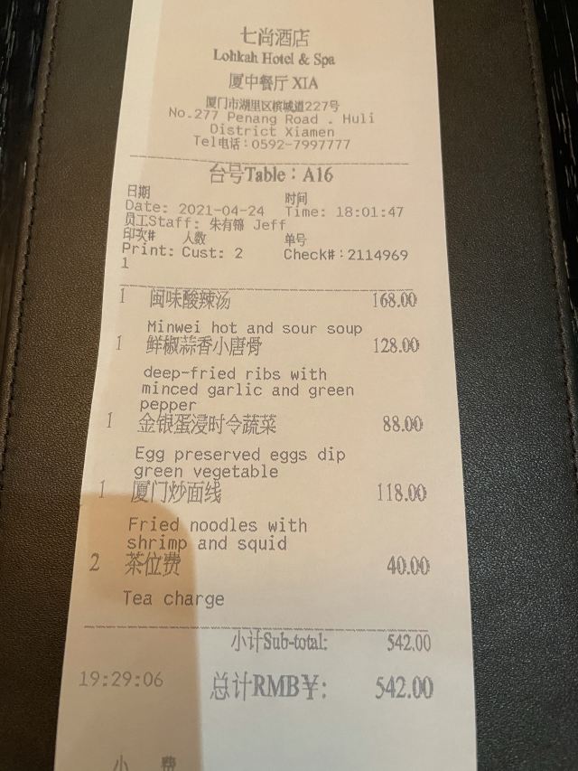 XIA Restaurant【环境】 位于五缘湾的七尚酒店,新中式的装修风格,化外一大片水池环绕,树影幢幢,白天蛮适合拍照的。室内中餐厅的光线则有点幽暗,不过环境看着也是走高端路线。 【口味】 「鲜椒蒜香小唐骨」原材料很新鲜,蒜香入味,肉质鲜嫩有弹性,推荐。 【服务】 服务重点说一下,简直差评!没有收15%服务费就可以这么嚣张吗? 1.那么大个酒店中餐厅,上菜速度一般,而且之前也没有小菜给客人打发一下时间,就让客人干等。 2.一人20块的茶位费,就因为他们自己泡了壶不知道是啥的茶就要20一个人?关键是那一壶茶也并没有放在我们桌上专供客人自己饮用啊?而是放在前台等着服务员来一桌一桌倒?所以就那么一壶茶好几桌共用还好意思要茶位费?潮福城鹭江喝晚茶都不敢这么做! 3.买单的时候,我看到茶位费的价格,问了一下服务员,为啥单独收费了我们却没有享受单独一壶茶?结果服务员直接炸起来,回了一句“也不是我规定的,收的钱也不是给我”,[疑问][疑问][疑问]客人就是了解一下收费情况,觉得不太合理提出问题,这就怼回来?! 酒店是没对服务员进行岗前培训吗??? 总结:实事求是,餐厅环境和菜品评价是不错,但个人而言,就冲着这个服务以后也不会来了。