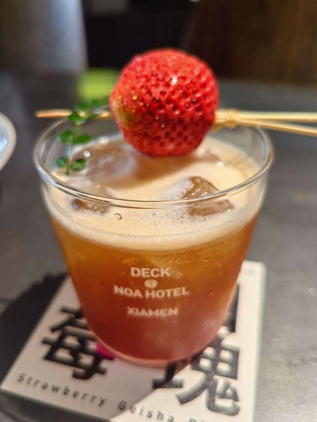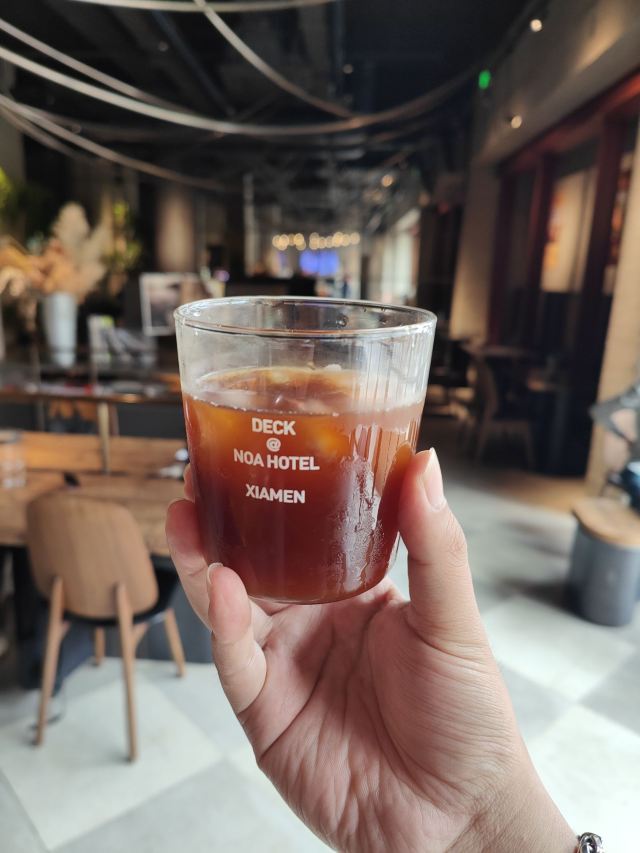 NOA Hotel Xiamen DECK COFFEE&TAPROOM雨中私语·氛围与味觉的双重共鸣 微雨洒落在落地玻璃之外,雨帘若隐若现,甲板DECK的大堂宛如一座柔光艺术馆。我们——两位一路并肩的姐妹,仅凭一个“打工人套餐”,却在这里坐足整个下午。 • 空间氛围 甲板DECK以工业风与热带植物交织,长桌与隔间并存,既能静享私密,也能参与热烈。雨声与低语,与店内暖黄灯光相互映衬,如同一幅流动的水彩画。 • 甜点序曲:开心果大理石蛋糕 入口即化,坚果的细碎在舌尖跳跃,淡淡奶香与绿色果仁的清新,如同姐妹间的悄悄话,甜而不腻。 • 主菜合奏:大肉盘 烤至微焦的肉排,层层肉汁在刀叉间绽放,伴着微辣蘸酱,每一口都是热烈的拥抱。我们相视一笑,满足感在唇齿间蔓延。 • 咖啡尾声:冰滴咖啡 冷冽而醇厚,像雨后初晴的空气,将刚刚的浓烈拉回宁静。凝视杯中深棕,我们在沉默里延续对话。 • 贴心服务 店员小哥哥笑意温暖,主动推荐茶香明前龙井小麦精酿;那一抹茶香扑鼻,丝毫无苦,让本不嗜酒的我们也心甘情愿为之举杯。 微雨未歇,我们却已沉醉在这场姐妹专属的城市漫游。