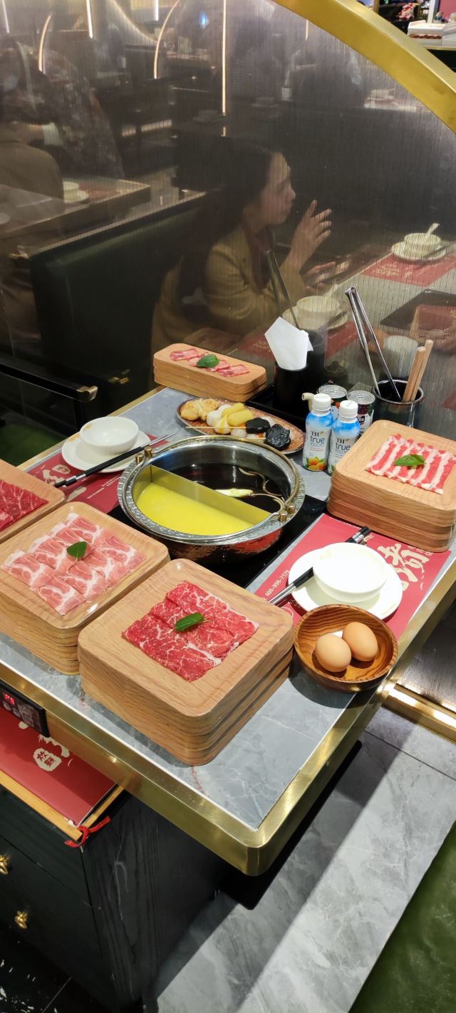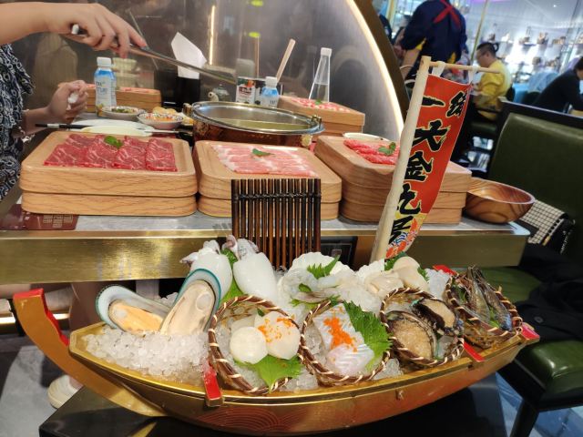 性价比超高的寿喜烧自助,我来也~ 一緒に和牛寿喜烧,位于SM新生活广场红宝石3楼。 这家最近火爆鹭岛,建议提前来排队哦。。。 下午5点开餐,3点半就有人来排队,不然吃不上第一轮。 自助餐有分四个档次:139元,169元,229元,259元。 不过因为疫情原因,第四档259元的目前不提供。 环境很不错呢,日式简约式风格,用屏风隔开,有小桌,中桌和大桌,适合亲朋好友聚餐,边聊边吃,其乐融融。 服务:小姐姐态度不错,日式服务,蹲着为你点单,口气温柔,时不时帮你加汤,咨询是否加菜。 菜品丰富,有自助式的饮料区,蔬菜区,水果区,更有冰淋淇,吃完火锅再来冰一下,爽歪歪。。。 锅底是寿喜锅+花胶鸡汤鸳鸯锅,真是绝配!先来喝碗花胶鸡汤,汤汁浓郁,超级好喝!寿喜锅就是咸甜咸甜,牛肉直接放寿喜锅,都不用蘸料的! 精选肉类无限吃,先各来了三盘。黑毛牛牛排肉,肉质厚料,口感细腻,变色即可捞出,裹上店内的鸡蛋液,好吃极了。薄切牛舌,沾着自制蘸料。连舌头都要吃下去了。 自助怎么能少了海鲜,直接点了个拼盘,有黑虎虾,Q弹墨鱼仔,青口贝,巴沙鱼,男友剥的虾,贝柱,扇贝,鲍鱼。食材新鲜,店员小哥哥还会帮忙剥虾,点赞点赞~~ 吃完火锅,吃个甜品甜甜嘴。鼠你最萌,超可爱;红颜姑娘鲜奶酪,口感顺滑。
