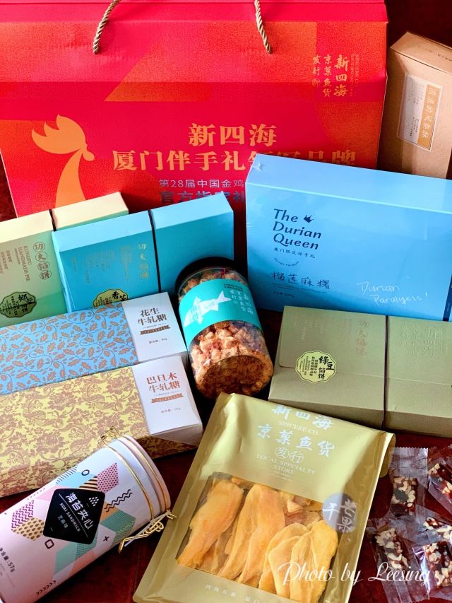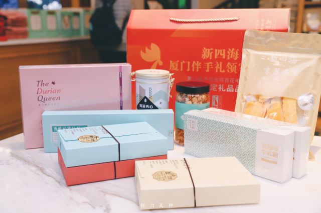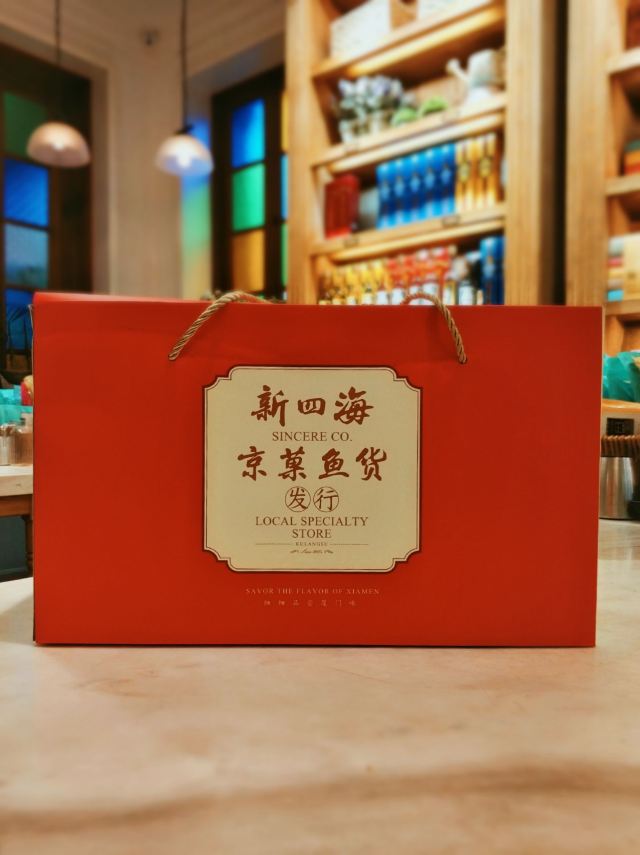 Xinsihai (zhonghualu)来厦必买!20多年鼓浪屿老字号伴手礼! 很多老厦门人一定对新四海这个品牌不陌生,是二十多年的老字号,还是金鸡百花奖的指定伴手礼。新四海的年货的包装,用的都是喜庆的颜色和元素,看起来就非常有过年的感觉,送人特别有面子。一大盒年货礼盒里东西也特别多,牛轧糖、馅饼、海苔夹心脆片、芒果干等,品类丰富,味道也很不错~除了大礼盒,还有馅饼和干货礼盒,同样也是诚意满满。如果不知道要选什么买,店里超多的试吃品可以随意尝,老板也太大方了吧!
