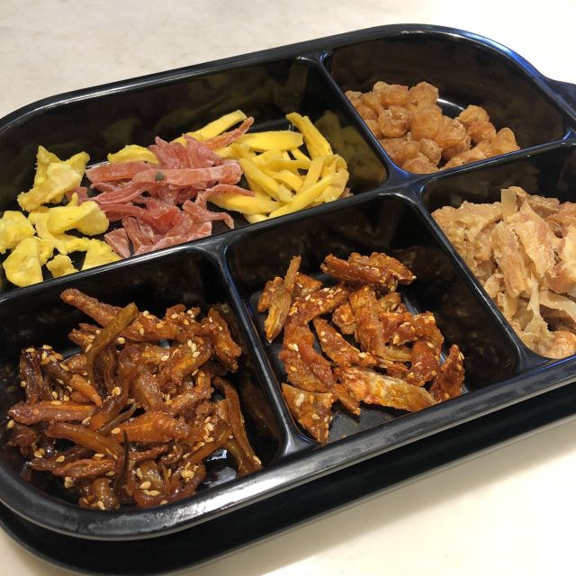 牛轧糖,桂圆干,鱿鱼丝,鱼骨头,虾干,椰子饼,肉干,馅饼王,鱼干片,老婆饼