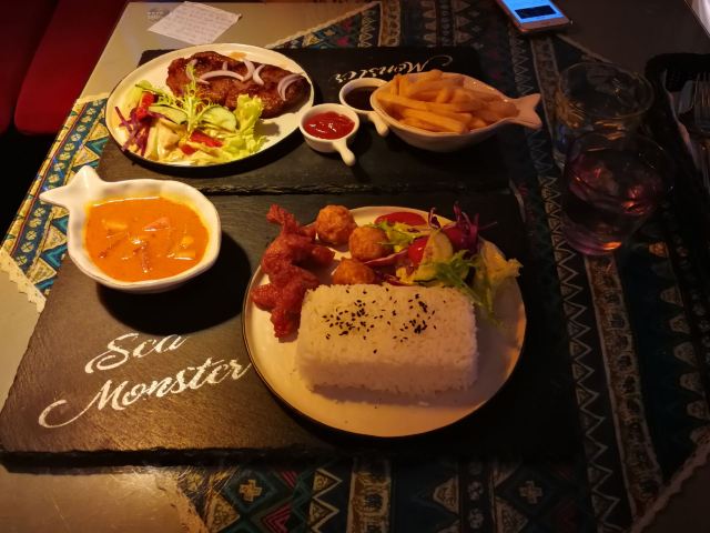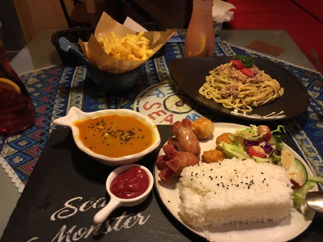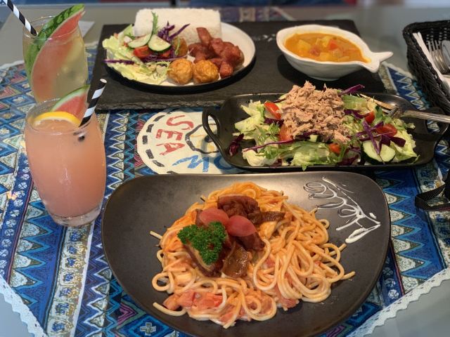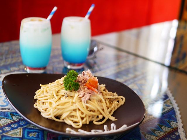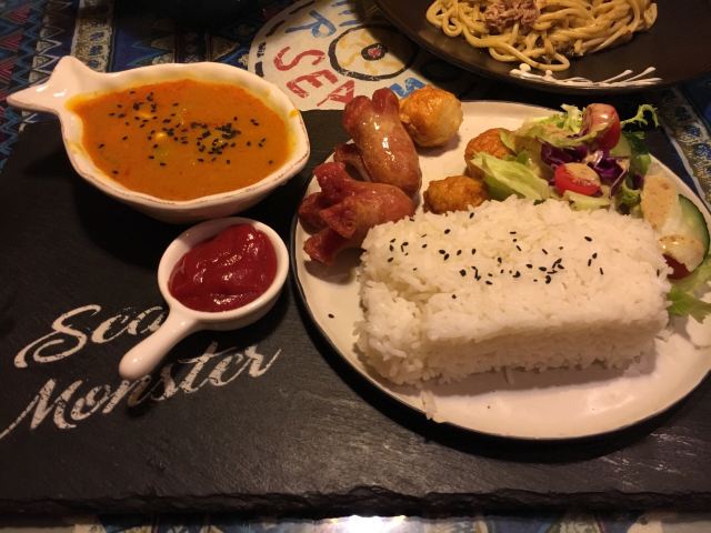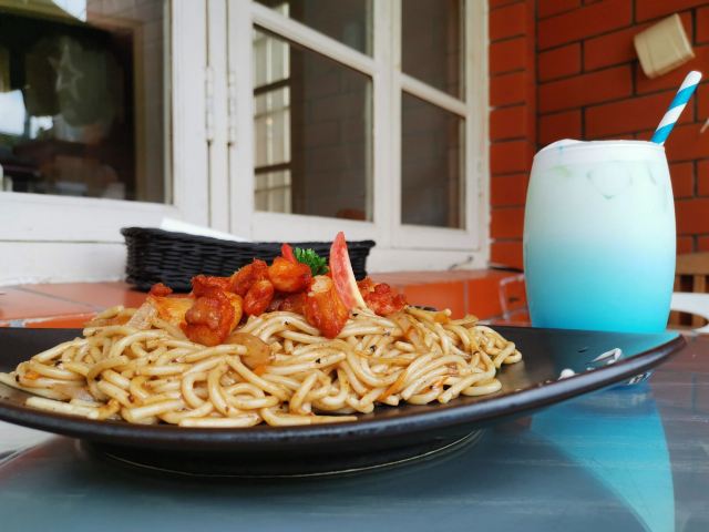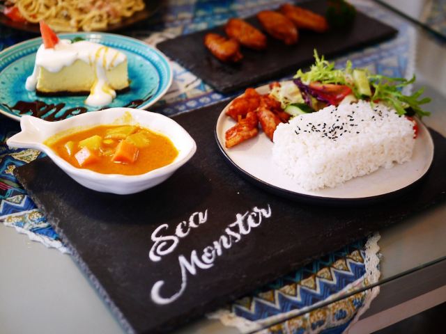 柠檬金枪鱼意面,香嫩鸡扒咖喱饭,烤鸡翅,现烤松饼,大理石蛋糕,海鲜咖喱饭,台湾香肠花枝丸咖喱饭,海怪咖啡,白兰地薄荷可可,香草汽泡奶,苏打番石榴,咖喱香肠花枝丸饭,薄荷可可