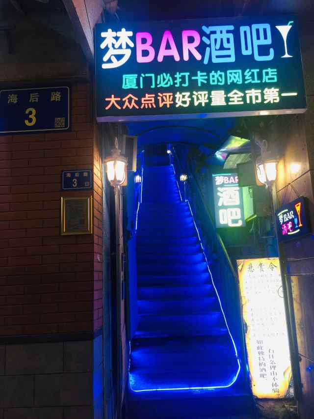 梦BAR·音乐酒吧,位于轮渡海后路3号,鹭江宾馆背后位置,中山路步行街路口处! 环境很不错的音乐酒吧,灯光迷人,座位充裕,有沙发软座,也有高脚椅吧台,还有一片露天的区域,可以喝喝小酒,赏赏月,店内晚间还有歌手驻唱,听听歌也很不错,休闲放松的氛围; 几款鸡尾酒都是颜值担当,醉江南,很有意境,梅子口味的鸡尾酒,酸甜好喝; 蓝色马尔代夫,蓝色的鸡尾酒,贝壳小船做装饰,搭配海洋元素,摆盘美观,口感清爽; 花前月下啤酒,冰镇爽口; 无酒精特饮,适合不喝酒的朋友,百香果味饮品,酸甜适中!