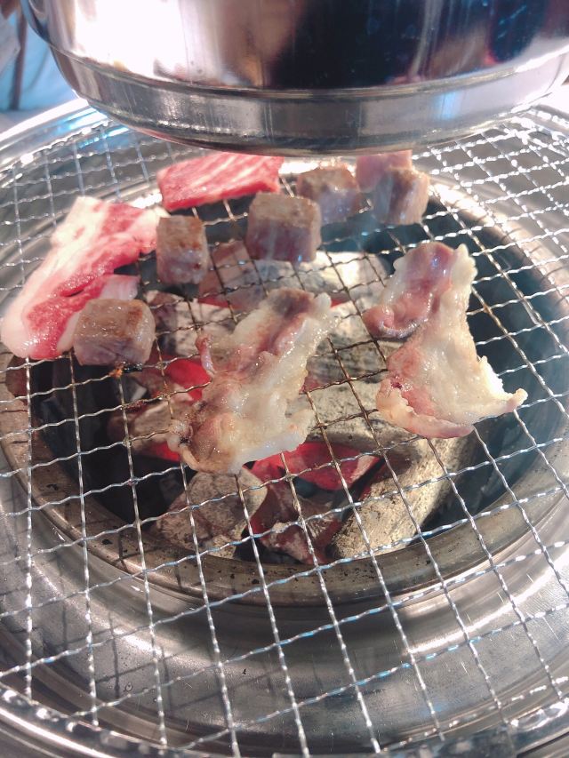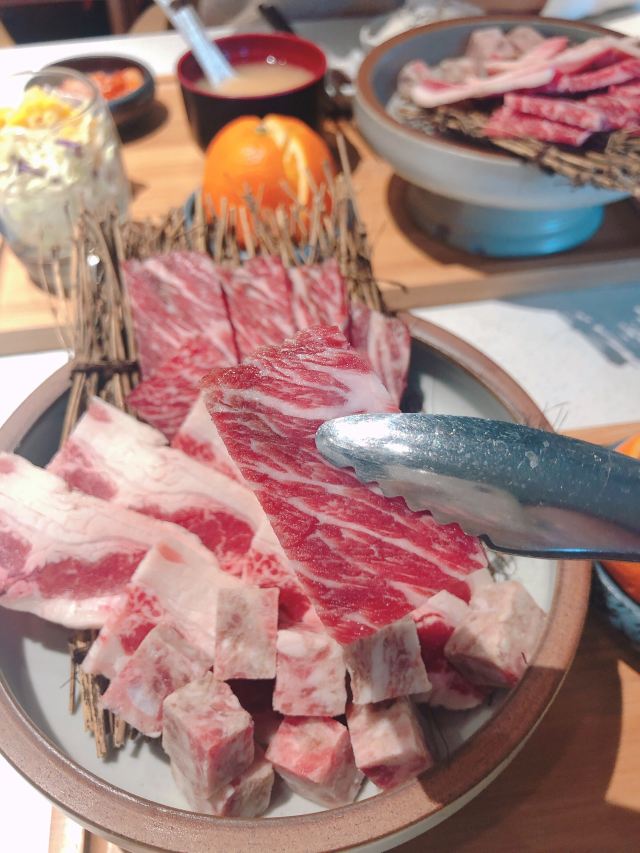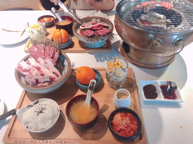 君半夏🙊🙊今年的第一份烤肉🙉🙉 听过好几次四海晴,等疫情好些了跟小伙伴一起来吃个中午定食。 ☎先电话咨询,表示一定是12:00开门营业,无法提前,需要做好准备工作,表示理解~ 我们12点前到的,需要在店门前排队,看到服务员做消杀看着也放心,进店前也有测量体温。 🦋环境: 一楼是单人餐用餐环境,每个位置都有帘子间隔,很赞的样子。 二楼是多人用餐区,也有隔间用帘子隔开,也有两三桌公共区,间隔也比较大。 🌱服务: 进门有测体温,引导入座,我们是两人用餐引导至二楼,贴心上了柠檬水,告知烤架上的吸烟管离烤架一杯水距离刚好等等。 定食上餐时间很快,几分钟就上餐了。 🍱日式定食 烤肉🥩三种肉食,看着质量不错,牛肉肉质文理好看鲜明,牛肉粒也赞😆 味增汤🍲味道有点咸,但是挺入味的。 泡菜🧀辣白菜,比较咸辣。 沙拉🥗喜欢,杯子可爱🥰 橙子🍊超级甜,水分多~ 🚗地址: 莲岳路东方明珠广场8-116(莲花路口1B地铁口旁)。
