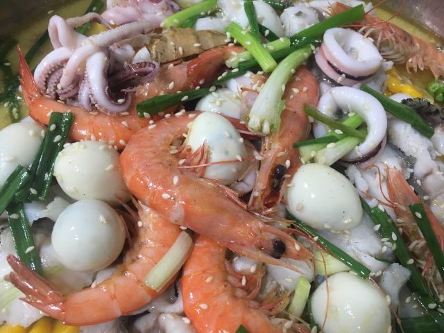 水煮鱼,水煮三鲜,腐竹,玉米,萝卜,鱿鱼,花菜,小管,娃娃菜,乌鱼片