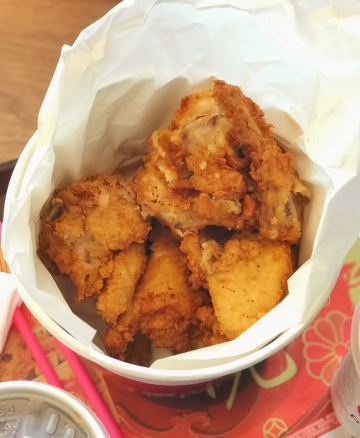 吮指原味鸡80周岁啦,1940-2020年的经典味道,肯德基为了庆祝推出了半价桶的活动 相信每个人的童年都有一份关于吮指原味鸡的味道记忆,本胖对于肯德基的其他产品也许不会有多少钟爱,但是对于原味鸡却时不时有想吃的冲动 官方广告说它经过11种秘制香料的腌制,80年坚持手工裹粉,高压低温烹炸,才成就它的酥脆、柔嫩、多汁 当然,广告是广告,原味鸡的皮一直都不属于酥脆,除了鸡腿其他部位的肉质绝对配得上“老”的形容,更不要提多汁了 抱怨归抱怨,真的吃起来还是“真香”定律... 含汉堡的半价桶是香辣鸡腿堡➕新奥尔良烤鸡腿堡,4块原味鸡,价格51元,吃完不过瘾,又加了一份6块原味鸡的纯鸡桶,价格44元,一定要记得找店员帮忙尽量更替成鸡腿!!! 嗝,好像把今年份的原味鸡吃完了,完毕