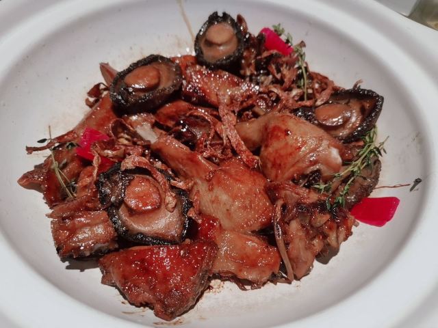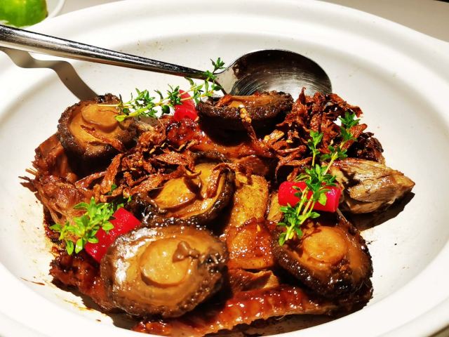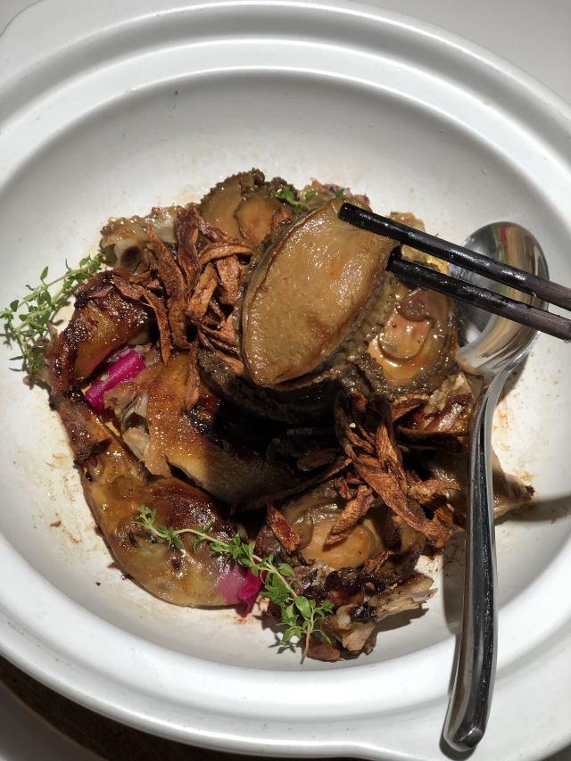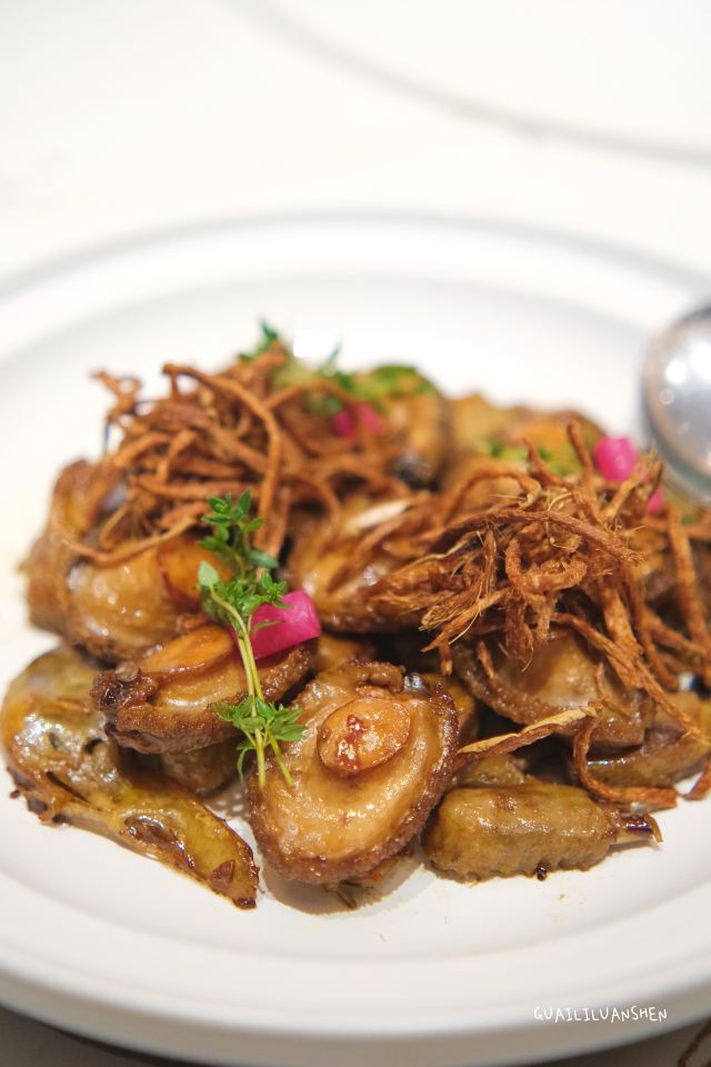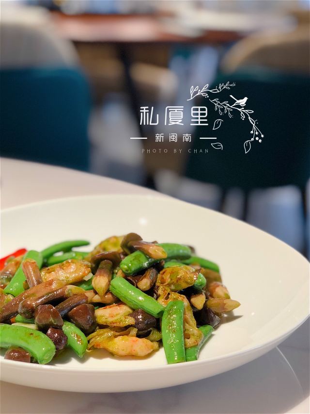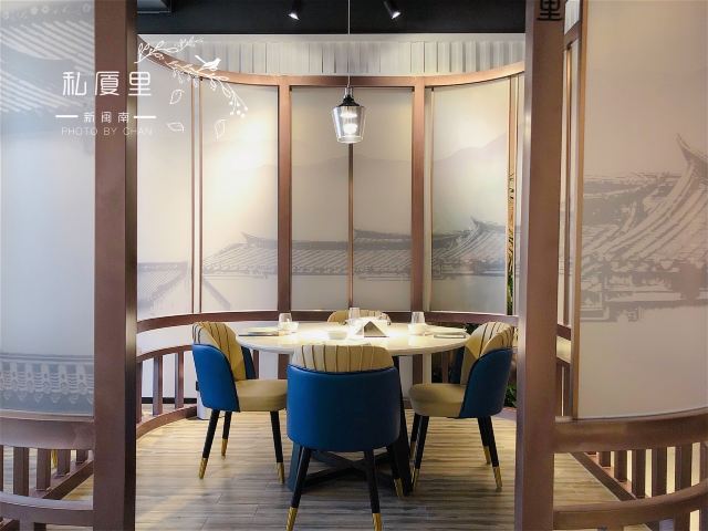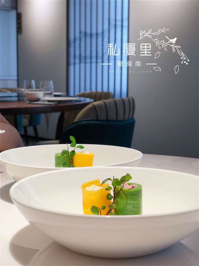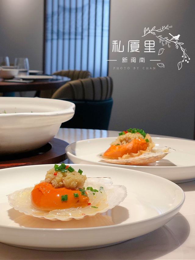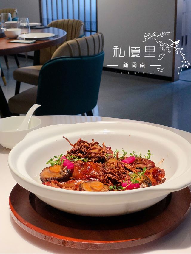 一直在路上的猫厦门创新闽南菜,将山海之鲜和闽南古早味完美结合。 【私厦里|新闽南】 地址:金边路566号B区B3栋2楼206。 环境:位于新开发的商圈古地石社,这边商圈的风景也很好,白天有湖景可观,晚上灯光璀璨。私厦里走的是新派的中国风。大气雅致,古风典雅但又不会沉闷。有大厅有包间,包间位置宽敞,非常适合聚餐,如果是宴请也很上档次。 菜品: 黑椒意大利醋汁骨:端上桌我以为是糖醋小排,我一直对糖醋的东西很抵触,觉得太甜太腻。吃了一块后真的给我太多惊喜。非常好吃。特意选了精排,比较薄,现代人注重健康,这样吃起来不腻。将闽南醋肉做法用来做排骨,让排骨有点酸甜的醋汁味,最上面撒了黑椒颗粒,更加丰盈了排骨的口感。肉香与醋汁与黑椒味完美融合,真的非常棒的口感。 松露葱油拌螺片: 推荐必点的前菜。螺肉切成薄片,松露的加持真的让螺片升华了,葱油酱汁让螺片不仅有松露的鲜还有葱油的香,一口吃下,螺片的脆嫩弹和独有的海鲜的鲜,加上松露独有的香气,十分美味。感觉吃一个都不过瘾,要多点几个。 绣球菌元贝炖腱肉: 在闽南,一盅好汤绝对比好菜还重要。一人一盅的绝味好汤。掀开盖子就可以闻到鲜味。绣球菌脆嫩爽口,元贝是这道汤鲜味的来源,赋予汤以特有的海鲜的咸鲜味,腱肉选的都是猪腱子肉,是瘦肉中的极品,瘦而有嚼劲,肉质香嫩不柴,中间带点筋,吸收了元贝的鲜而格外美味。撒了芹菜碎汤汁更加清甜,喝上一盅真的美了。 私厦焖鲍姜母鸭: 私厦里招牌一饭一汤一菜中的一菜,绝对的招