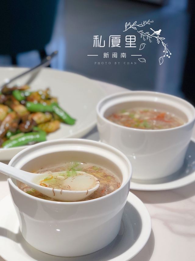 怪力_乱神▪️以前总觉得,闽菜不像其他的菜系那样能呈现出不同的花样,吃来吃去还是那几样。这两年,不少新派闽菜登场,赋予了新的意义,其中私厦里就是其中之一。 . ▪️闽菜大师林水平的私厦里,已经两周年了,不得不说时间过的很快。有幸参与了开业的晚宴,这次又参加两周年庆,也算是见证了这个品牌的成长。 . ▪️私厦里的菜品,无论从出品还是口味,都非常有水准,所以时常自己也会带着家人来,或者推荐给身边的同事朋友们,非常适合聚餐和宴请。 . ▪️两周年当然要有一些不一样的东西呈现,茶酒文化和餐食的融合就是一大亮点。不同的美味搭配不同的美酒和茶,就能产生不一样的味觉体验。 . ▫️餐前养胃米粥燕条,养生又开胃,在酒局开场之前食用再合适不过。 . ▫️私厦里的菜品道道精致,在小菜上就体现的淋漓尽致。开胃仔姜浸花螺、醉香汁浸老蛏、咖喱鲂鱼冻、沙茶拌绿笋,说是小菜,每一道都可以拿来当大菜上桌。 . ▫️哆头蛏鱼翅控蛋是我最喜欢的汤品了,选用莆田的多头蛏,加上鱼翅和蛋,味道鲜美难挡,喝下一碗还想再来。 . ▫️虾汤虾饺面的味道堪称一绝。用闽南人喜爱的狗虾熬汤,汤头呈橙红色,虾饺里的虾仁个头不小,呼之欲出,每一条浸过虾汤的面既筋道又有味道。 . ▫️私厦焖鲍姜母鸭是来店必点的招牌,好吃到可以光盘,就连里面的姜都是酥脆的,全部吃光也不是问题,鸭肉就更不用说了,软烂入味,搭配红葡萄酒真的绝了。 . ▫️鱼籽酱燕麦烩角螺片,底下是燕麦熬制的粥,其中夹杂着爽脆的螺片,上面还撒着鱼籽酱,每一种食材的添加都恰到好处,汇聚在一起成就了这道美味。 . ▫️砂锅黄椒焗沙板蟹,这道菜可以说是色香味俱全,而且还能一览大厨的手艺。整道菜都是在你面前完成的,随着洋酒淋上锅盖再掀起,一锅冒着热气的松叶蟹料理展现在面前。蟹肉鲜美紧实,味道让人称绝。 . ▪️这次的两周年,给来店的客人也准备了不少惊喜,5.7-5.15期间来店都会送咖喱鲂鱼冻,充▪️▫️值还有送新菜和鲍鱼姜母鸭的活动。快带上家人,来体验一回不用做饭的快乐~