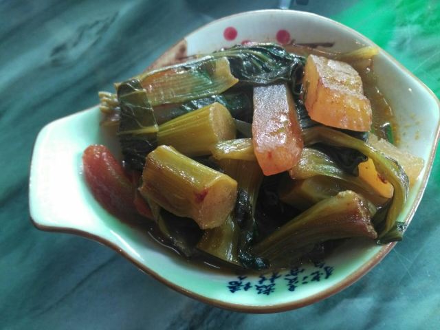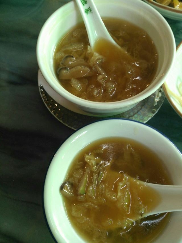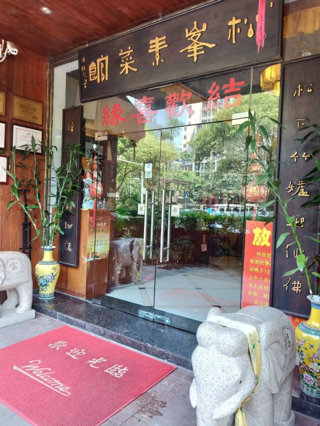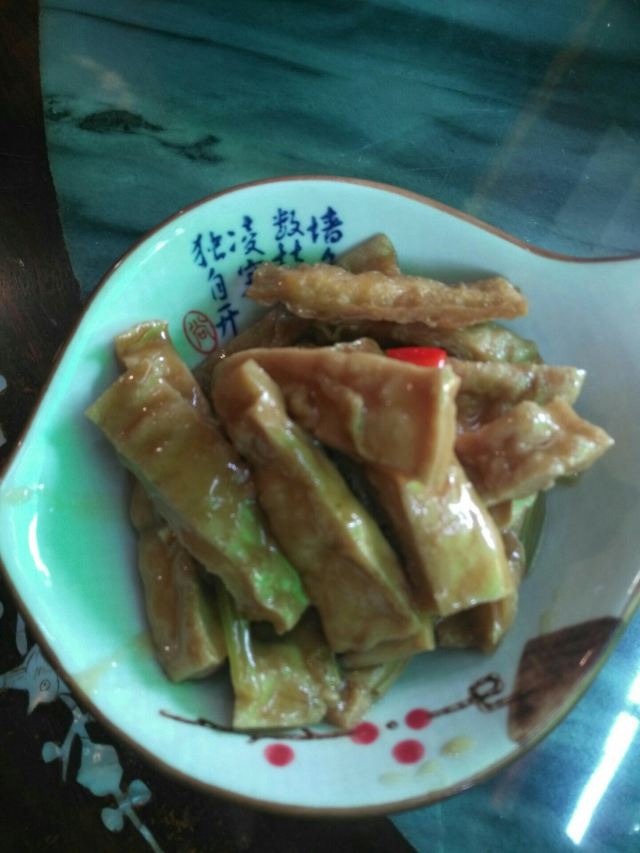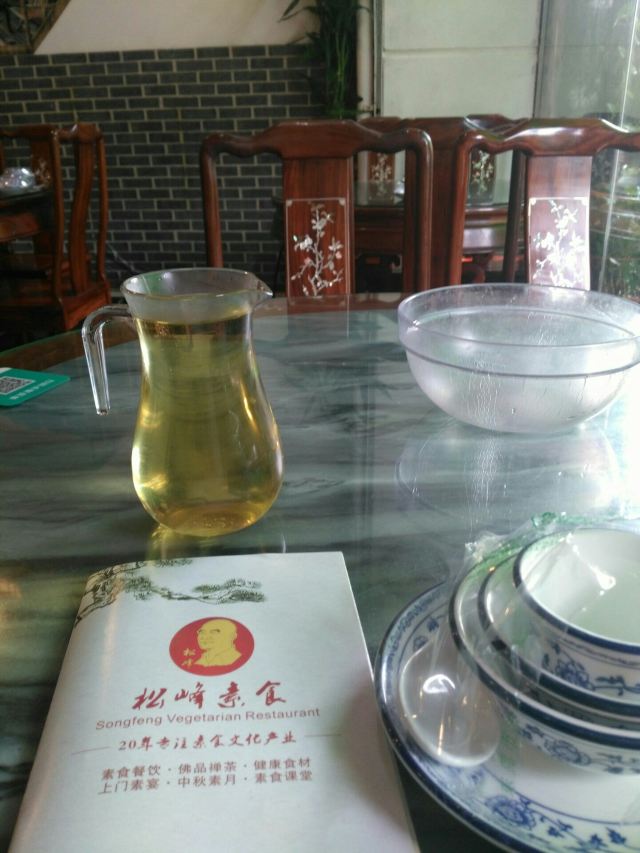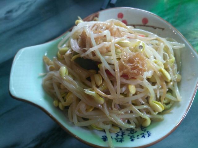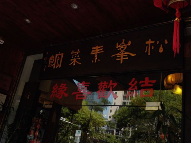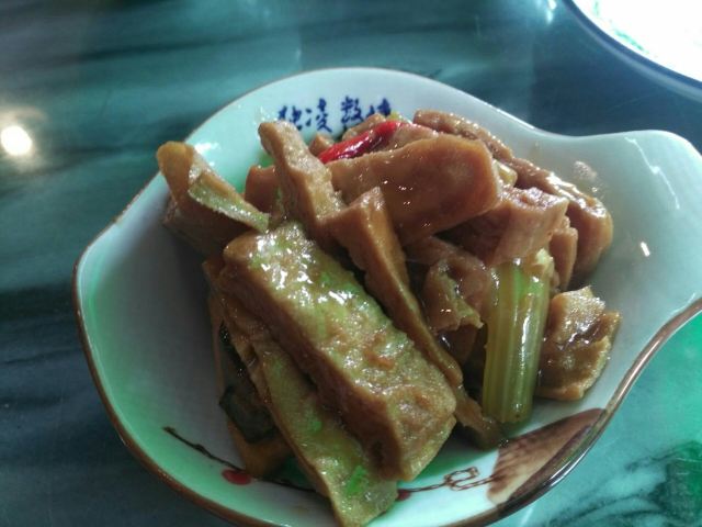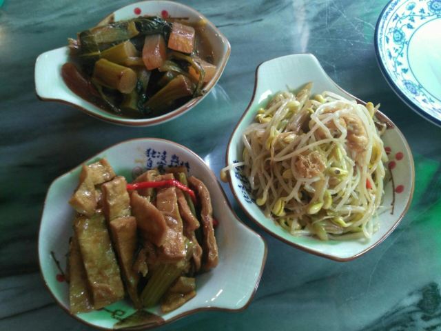 松峰素食馆(三) 菜单上的"二十年经典小菜",每份3元,图一至图三分别是豆干、豆芽和什菜,最后来个合影哈(见图四)。卖相挺好,小碟子也挺雅致哒,是吧?味道也不错,挺下饭,什菜偏甜一点。