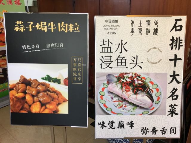 烧鹅,炒生鱼片,牛肉粒炒蒜蓉粒,鱼肠菜心,酱油皇焗虾,鱼蓉粥,碌饿,飘香桂花鱼,姜葱焖大鱼,砂锅焗洋葱百合