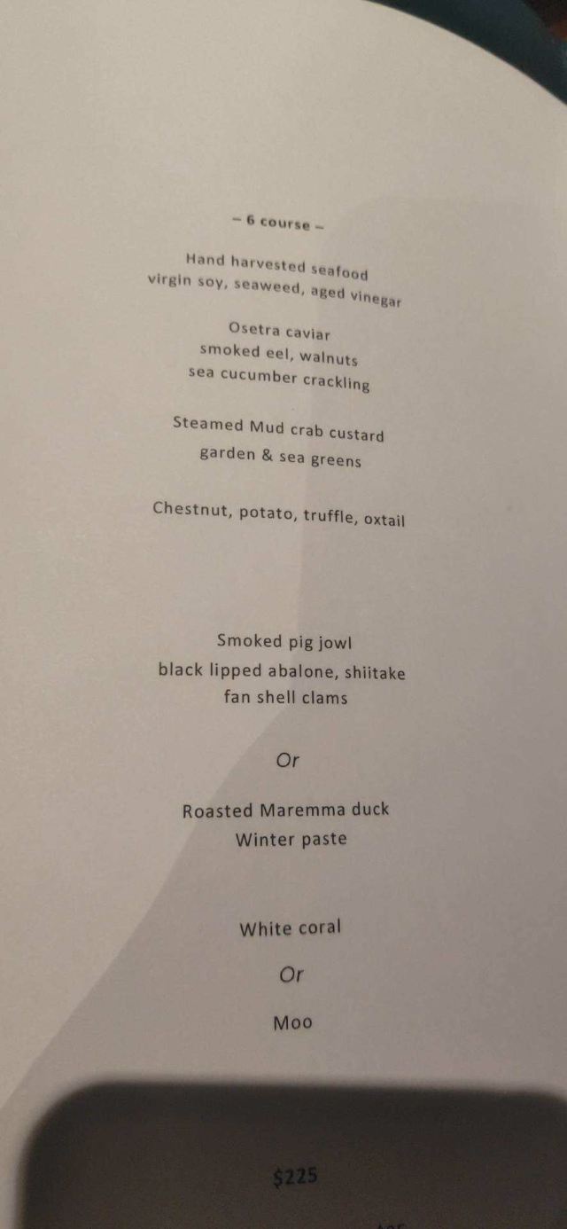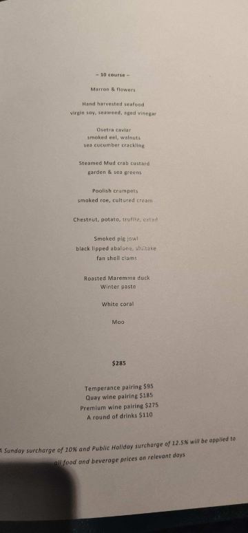 Quay朋友定的位子,环境挺好,外面的景也好,从上菜到吃完最后一道菜整整3个小时,菜品精致,点的是10道菜的单子,也不懂英文,上菜就有服务员给讲解,他说的我也不懂,要的10道菜好像前后上了十二三道菜,每道菜都换餐具,刀叉的颜色也不一样,个人吃不惯西餐的味道,就是感觉鲜,嫩,吃个环境,吃个景吧,菜也没有照全