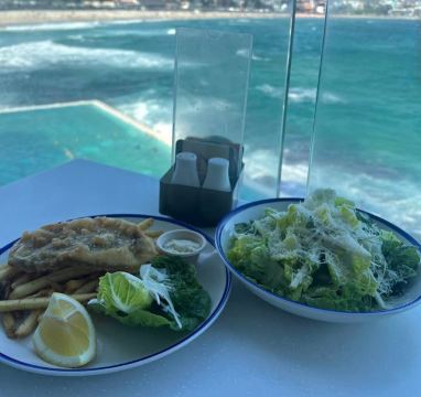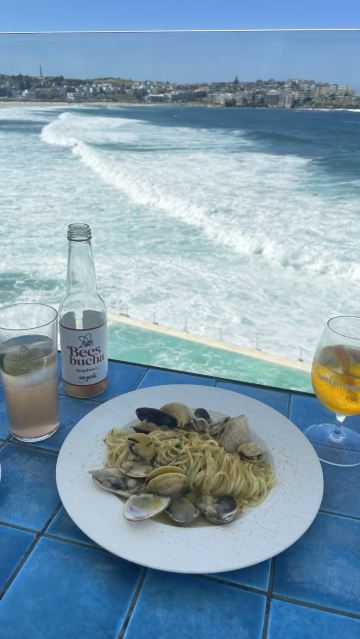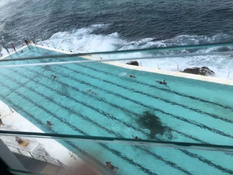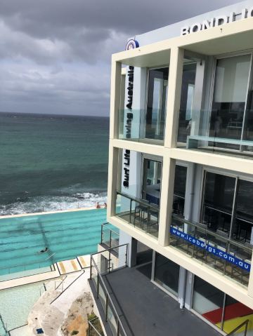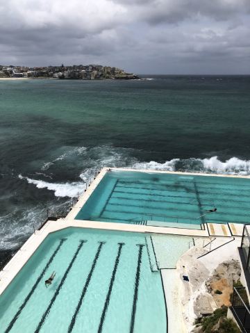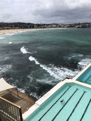 交通很方便,公交车可以直达。下车之后我们就直接到网红餐厅Iceberg吃饭了,因为从餐厅可以下到游泳池,并且可以俯瞰整个海滩~ 景色挺美的,但因为温度比较低,我们没有下去游泳。游泳的话每人7澳元,不算贵的! 走到海滩边很多人在玩排球等游戏,也有人在冲浪,一遍遍地游进海里,再乘着浪花踩到冲浪板回到岸边……看着让人感觉他们体质真好…