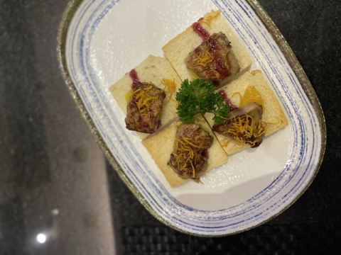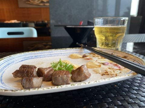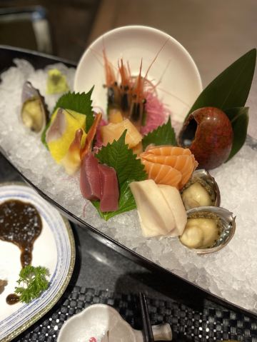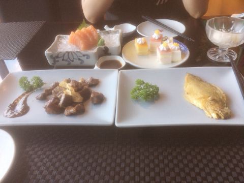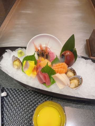 牛肉厚烧,三文鱼刺身,蒜蓉焗生蚝,什锦天妇罗,蒲烧鳗鱼,鹅肝,刺身,红酒鹅肝,炸鸡块