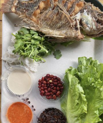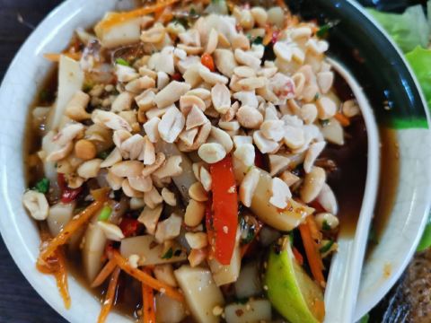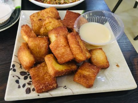 简简单单的家家来西双版纳旅游,搜索发现这家杨杨小吃店,跟着导航来到小店,说实话不太好找。运气不错,五点到店,还有吃的,据说每天下午需要预约,我们吃饭时候好多没有预约的无奈离开。 [环境]小店在居民区胡同内,不太好找,跟着导航到地方看路边的指示牌即可找到。 [服务]服务热情,老板特别热情,吃饭这天是端午节,老板特意给每桌发了粽子,特别感动,老板看我们生菜快吃完了,特意询问是否再来点生菜,又给了一大份。 |菜包鱼^第一次吃这样的,星光夜市到处都是菜包鱼,因为感觉不太好没有尝试,这种鱼没有小刺,用生菜包起来吃着挺不错的 |油炝心管^这个菜说实话第一次见,第一次吃,味道挺不错的,心管吃着嚼劲十足,主要我不吃姜,需要把姜剥开,不然吃着更舒服 |黄金吐司^这个黄金吐司完全颠覆我的想象,我以为没有什么特别的,但是吃到嘴里完全不同,推荐,趁热吃。 |舂黄瓜^和我那里的凉拌黄瓜基本上一样,用的料不同,更酸辣。 整体来说,这顿饭吃的特别满意,套餐性价比高,以后有机会来版纳还会再次来。