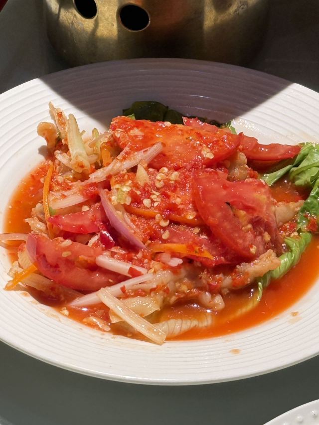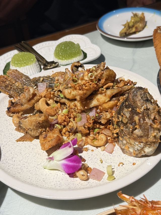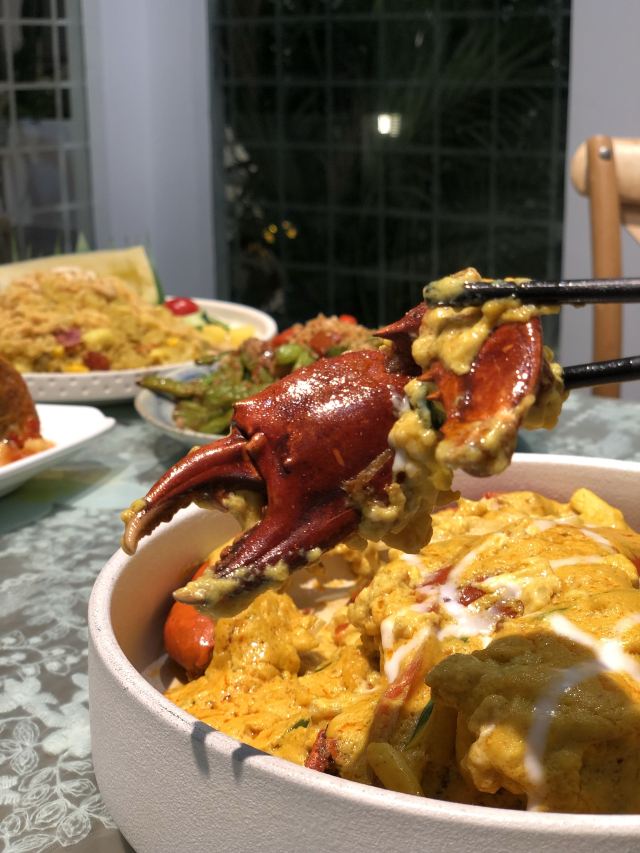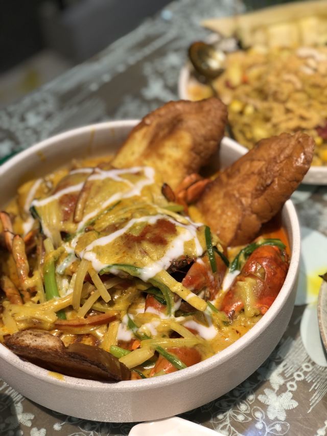 陈三啊认真来说,他们家位于告庄并且属于网红店的出菜标准来说菜品质量算不差的新店。 特意的点了2个不一样的螃蟹做比较, 奶香黄咖喱炒蟹 和 古法黄金咖喱炒蟹 ! —————— 古法黄金咖喱炒蟹 古法咖喱做法意思是,这种做法的确在泰国时候吃过的偏多,就是咖喱不是汤水型的咖喱奶味,而是更稠的咖喱奶味!是炒出来的,是加了鸡蛋了吗?越炒越稠,炒到那个稠度刚好可以了! ✨ 奶香黄咖喱炒蟹 就是奶香味的咖喱蟹~算得上是他们家的1号店移植过来的招牌菜品吧… ✨ 但是两道菜品的螃蟹可圈可点,螃蟹新鲜的而且还很大只,肉质是紧贴螃蟹壳的那种!个人推荐 古法黄金咖喱炒蟹 ~! —————— 越南原只烧春鸡 是一只鸡,鸡肉不算柴,单独不配酱料吃也好吃~配上辣子面干蘸都很不错,这道菜也推荐。 —————— 泡鲁达 他们家的泡鲁达,椰奶味很足,小料给的也很多,因为是收藏打卡领取的,所以还是推荐啦!! —————— 服务:工作人员基本都还是在忙的上菜,但是我过去换盘子时候服务员还是很配合工作的,虽然算不上亲力亲为的服务但是,有应必求。这点不错啦! 3个人吃了:599~ (人均:200,因为是特意多点的哈!所以才这么高的!)