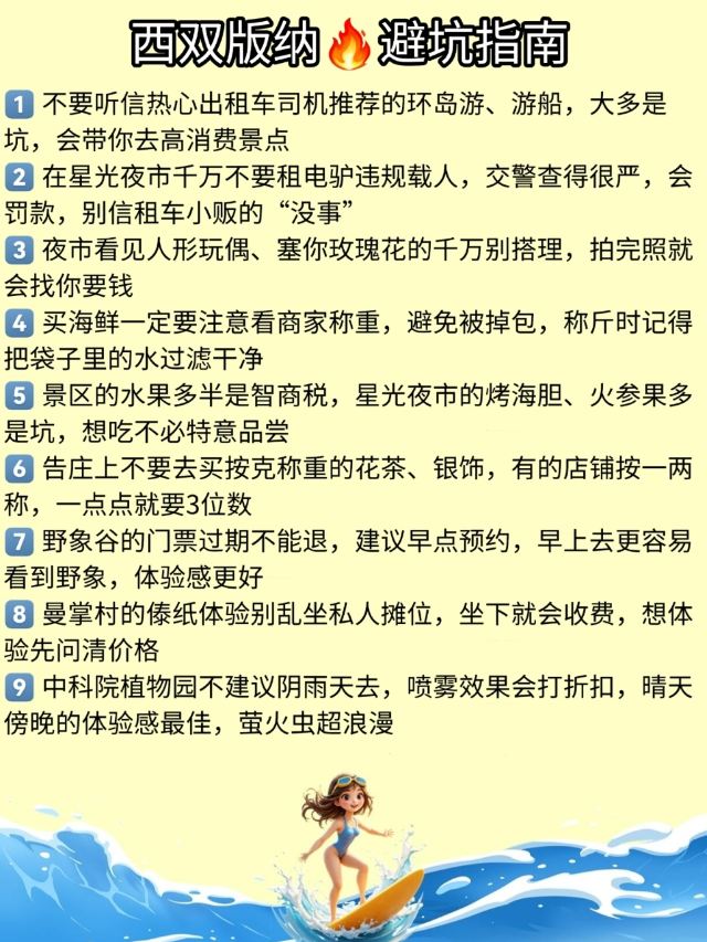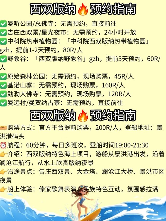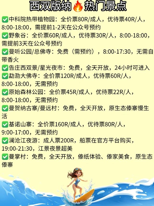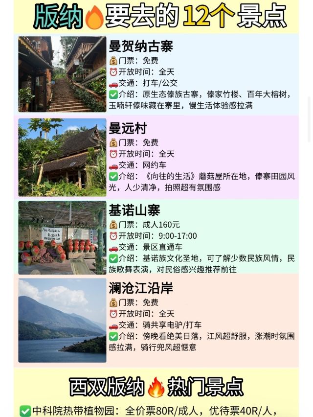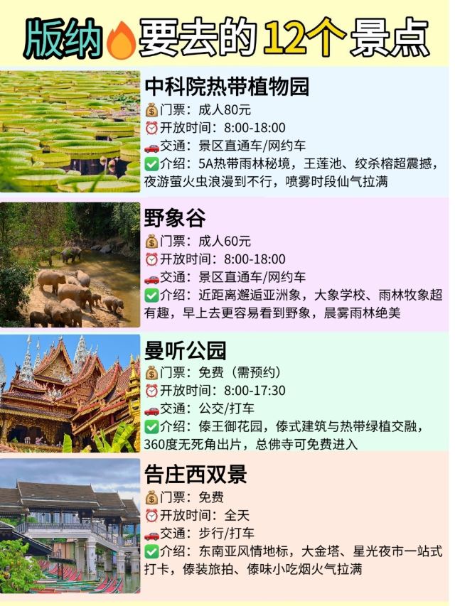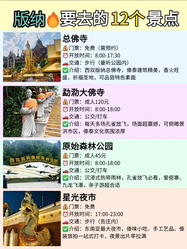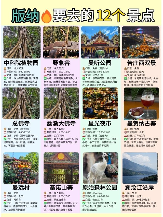 白云666-西双版纳📍这1⃣2⃣个景点不要错过|附游玩攻略 4-6月想来西双版纳的姐妹看过来啦!!给大家总结了一下西双版纳的热门景点,大家可以看看再出发哦!! ✅三日游路线参考 ⭐Day1:曼听公园 ➡总佛寺 ➡告庄西双景 ➡星光夜市 ⭐Day2:野象谷 ➡原始森林公园 ➡勐泐大佛寺 ➡澜沧江沿岸 ⭐Day3:中科院热带植物园 ➡基诺山寨 ➡曼贺纳古寨 ➡曼远村 【特别推荐】: ✔澜沧江夜游:从市区打车到景洪码头即可,官方平台可购票,60分钟航程,多班次运营。途经景点:景洪港➡告庄西双景➡大金塔➡澜沧江大桥➡景洪市区夜景,夜景超绝!坐游船吹着江风看两岸灯火,傣式风情氛围感拉满~ ✔中科院热带植物园:热带雨林秘境超震撼,王莲池、绞杀榕出片满分,傍晚晴天还能邂逅萤火虫,仙气十足 ✔野象谷:清晨去偶遇野生亚洲象几率超高,大象学校互动超有趣,晨雾中的雨林美到失语 ✔星光夜市:东南亚最大夜市,傣味小吃、傣装旅拍一站式打卡,夜晚灯火璀璨超好拍 ✔告庄西双景:大金塔标志性地标,东南亚风情拉满,逛吃拍照两不误 ✔必吃美食 泰椰天香·六国料理羊驼店(二分店) 缅挝泰·东南亚花园餐厅 云雀金湾·云南菜·孔雀宴手抓饭(星光夜市店) 玉喃轩·傣味特色餐厅(曼贺纳店) 西双十二寨·民族餐厅 ✔必住酒店 柏丽拉度假酒店 #西双版纳旅游攻略#西双版纳泼水节#西双版纳美食#西双版纳美食推荐#西双版纳旅游 #西双版纳攻略 #热带花卉园 #春日赏花#云南旅游 #亲子游好去处#西双版纳住宿