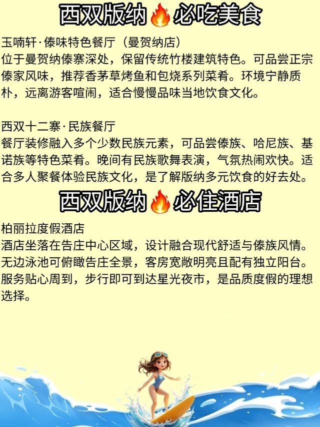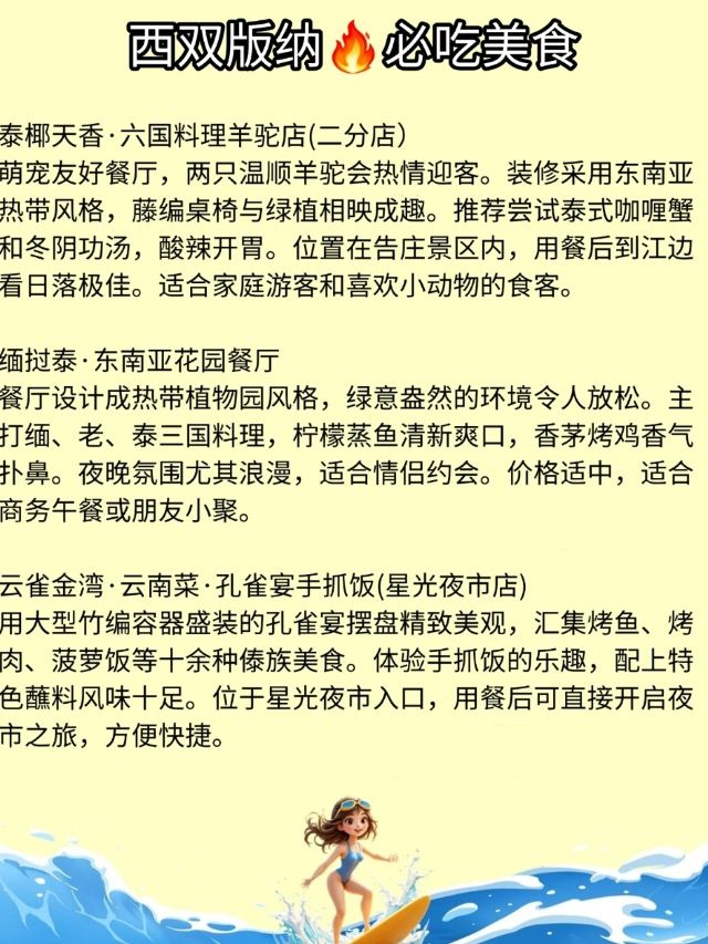 Thai Coconut Heaven·Six Countries Cuisine (Gaozhuang Yi Branch)西双版纳📍这1⃣2⃣个景点不要错过|附游玩攻略 4-6月想来西双版纳的姐妹看过来啦!!给大家总结了一下西双版纳的热门景点,大家可以看看再出发哦!! ✅三日游路线参考 ⭐Day1:曼听公园 ➡总佛寺 ➡告庄西双景 ➡星光夜市 ⭐Day2:野象谷 ➡原始森林公园 ➡勐泐大佛寺 ➡澜沧江沿岸 ⭐Day3:中科院热带植物园 ➡基诺山寨 ➡曼贺纳古寨 ➡曼远村 【特别推荐】: ✔澜沧江夜游:从市区打车到景洪码头即可,官方平台可购票,60分钟航程,多班次运营。途经景点:景洪港➡告庄西双景➡大金塔➡澜沧江大桥➡景洪市区夜景,夜景超绝!坐游船吹着江风看两岸灯火,傣式风情氛围感拉满~ ✔中科院热带植物园:热带雨林秘境超震撼,王莲池、绞杀榕出片满分,傍晚晴天还能邂逅萤火虫,仙气十足 ✔野象谷:清晨去偶遇野生亚洲象几率超高,大象学校互动超有趣,晨雾中的雨林美到失语 ✔星光夜市:东南亚最大夜市,傣味小吃、傣装旅拍一站式打卡,夜晚灯火璀璨超好拍 ✔告庄西双景:大金塔标志性地标,东南亚风情拉满,逛吃拍照两不误 ✔必吃美食 泰椰天香·六国料理羊驼店(二分店) 缅挝泰·东南亚花园餐厅 云雀金湾·云南菜·孔雀宴手抓饭(星光夜市店) 玉喃轩·傣味特色餐厅(曼贺纳店) 西双十二寨·民族餐厅 ✔必住酒店 柏丽拉度假酒店 #西双版纳旅游攻略#西双版纳泼水节#西双版纳美食#西双版纳美食推荐#西双版纳旅游 #西双版纳攻略 #热带花卉园 #春日赏花#云南旅游 #亲子游好去处#西双版纳住宿