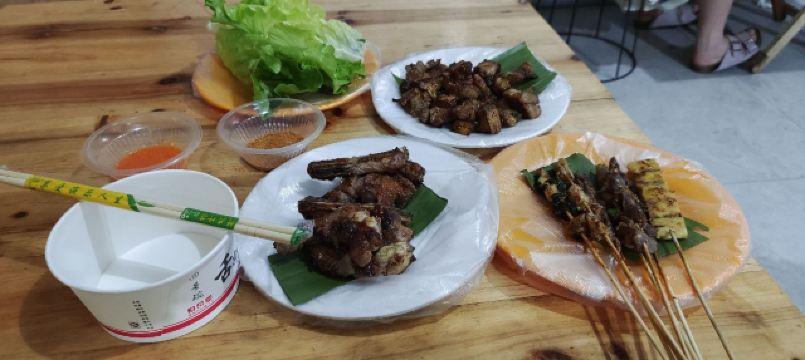 完全没有get 到版纳的烧烤是怎么火的,难道是来的游客都没有吃过烧烤?还是对版纳的餐饮实在无奈?才导致这种国民化的东西居然在版纳小火一P?这家从环境到食材和口味完全是地摊苍蝇馆的风味,这就好比说一人身上风尘味太浓,就这居然小火了,导游推荐本地人推荐出租车司机推荐……嗯似乎哪里有点不对劲啊😯?其实呢,版纳🈶那么多的民族风味餐馆,傣族风味、哈尼族风味、基诺族、东南亚(泰、缅、马来、老挝、越南)风味的餐厅,还有内地的川、渝、京、东北口味的餐馆,随便找一家坐下好吃顿饭,都比吃烧烤强。来出差、旅游、过冬、短住完全没必要旅游脑发作去烧烤,(俺当时也是旅游脑发作跑去的)。来边地游玩,最主要的就是体验当地的风味菜,烧烤这种典型国民化的食物就完全没必要去费钱费时。