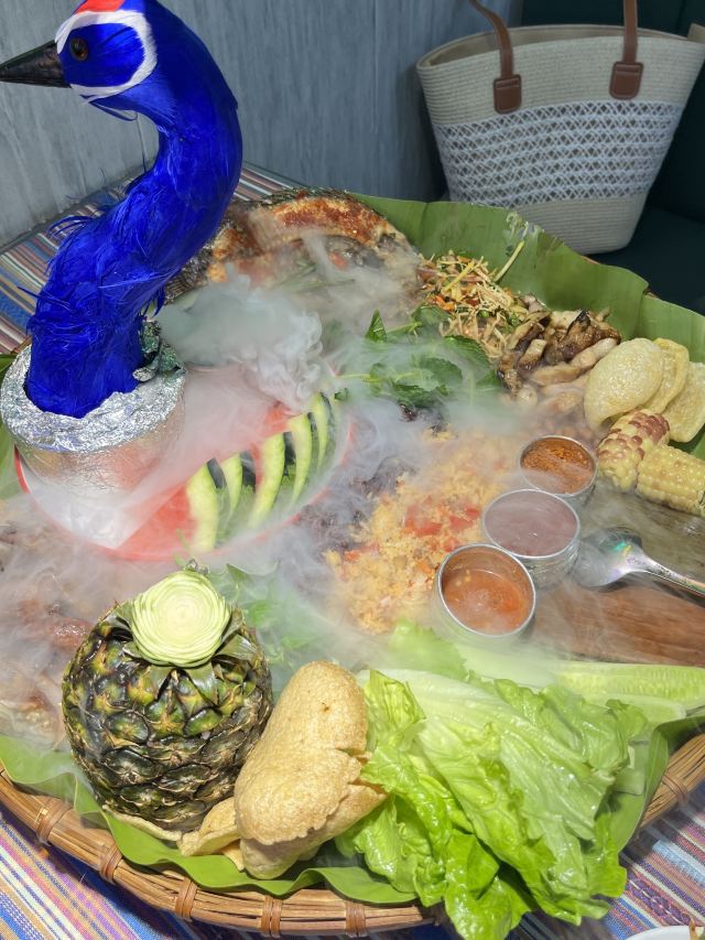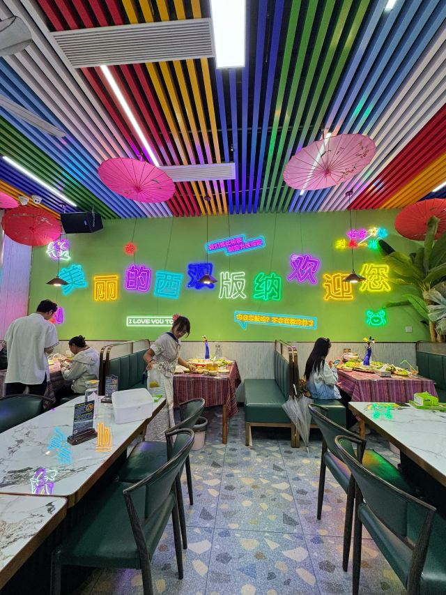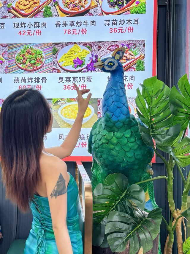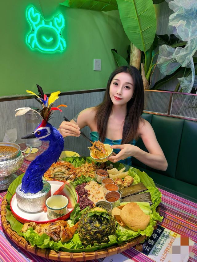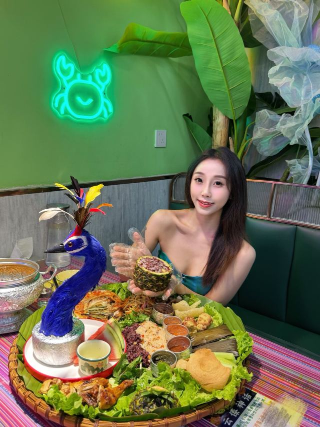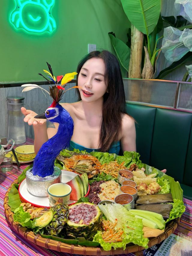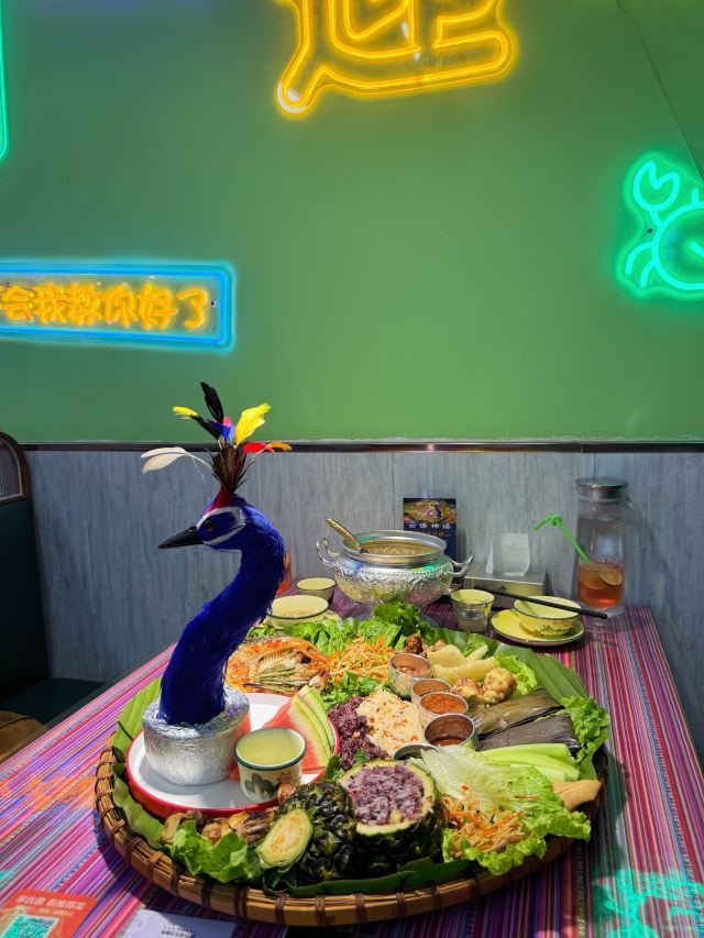 一上桌,孔雀造型的摆盘便惊艳众人。五彩斑斓的糯米饭如孔雀华羽般绚丽,各类热带水果簇拥周边,新鲜欲滴散发着诱人果香。傣家烤鱼表皮金黄酥脆,内里鱼肉鲜嫩多汁,香料的独特气息完美融入其中。还有那香茅草烤鸡,鸡肉紧实,香茅草的清香萦绕舌尖,令人回味无穷。 精致的竹编餐具,充满浓郁傣家风情。餐厅环境雅致,绿植环绕,轻柔的傣族音乐若有若无地飘荡,仿佛将食客带入神秘的热带雨林。 服务人员身着传统服饰,热情地介绍每一道菜品,贴心周到。在这里,品尝孔雀宴不仅是味蕾的享受,更是一场视觉与文化的盛宴,深度领略西双版纳独特的美食魅力,每一口都满是惊喜与满足。