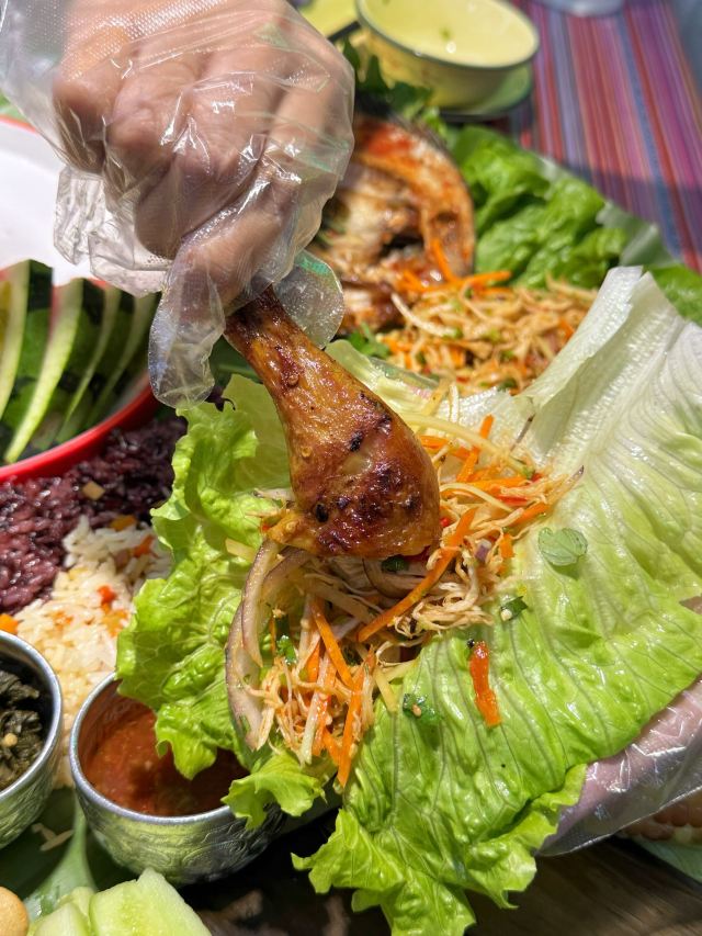 雪琪旅行记一上桌,孔雀造型的摆盘便惊艳众人。五彩斑斓的糯米饭如孔雀华羽般绚丽,各类热带水果簇拥周边,新鲜欲滴散发着诱人果香。傣家烤鱼表皮金黄酥脆,内里鱼肉鲜嫩多汁,香料的独特气息完美融入其中。还有那香茅草烤鸡,鸡肉紧实,香茅草的清香萦绕舌尖,令人回味无穷。 精致的竹编餐具,充满浓郁傣家风情。餐厅环境雅致,绿植环绕,轻柔的傣族音乐若有若无地飘荡,仿佛将食客带入神秘的热带雨林。 服务人员身着传统服饰,热情地介绍每一道菜品,贴心周到。在这里,品尝孔雀宴不仅是味蕾的享受,更是一场视觉与文化的盛宴,深度领略西双版纳独特的美食魅力,每一口都满是惊喜与满足。