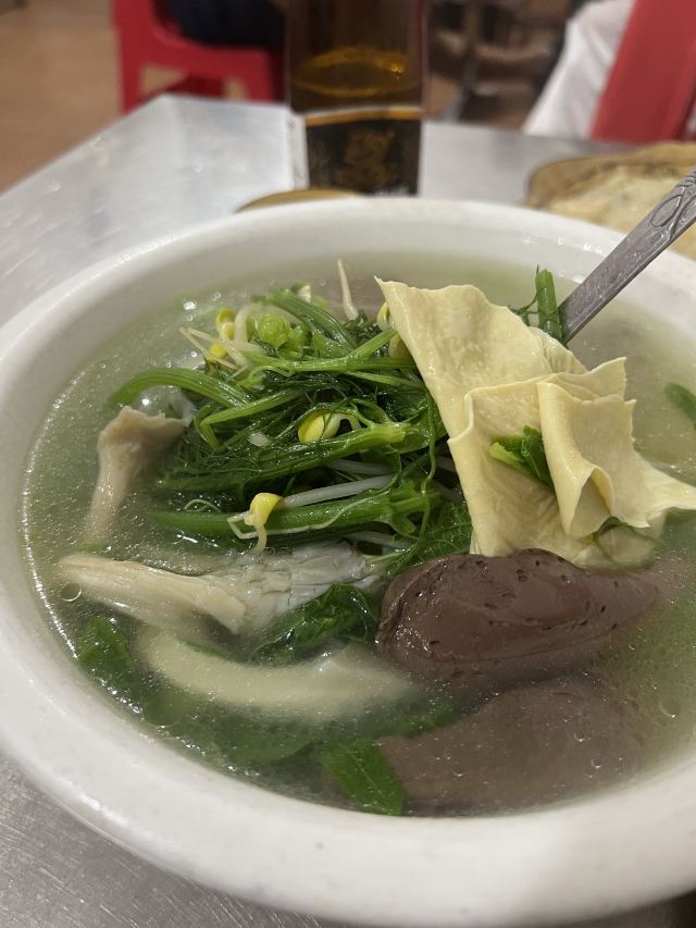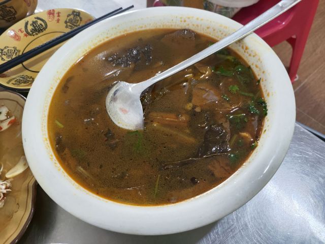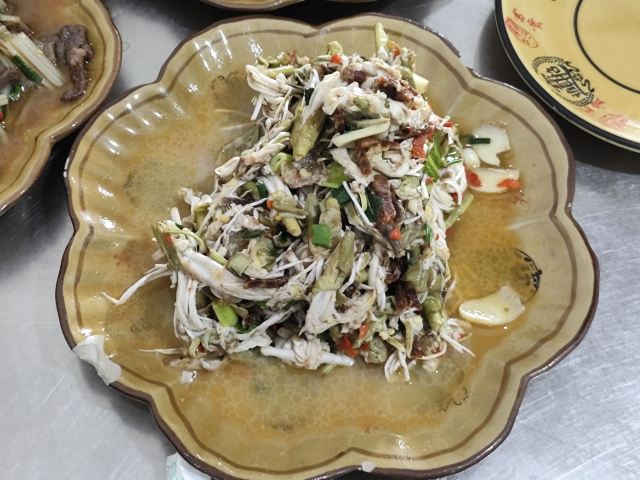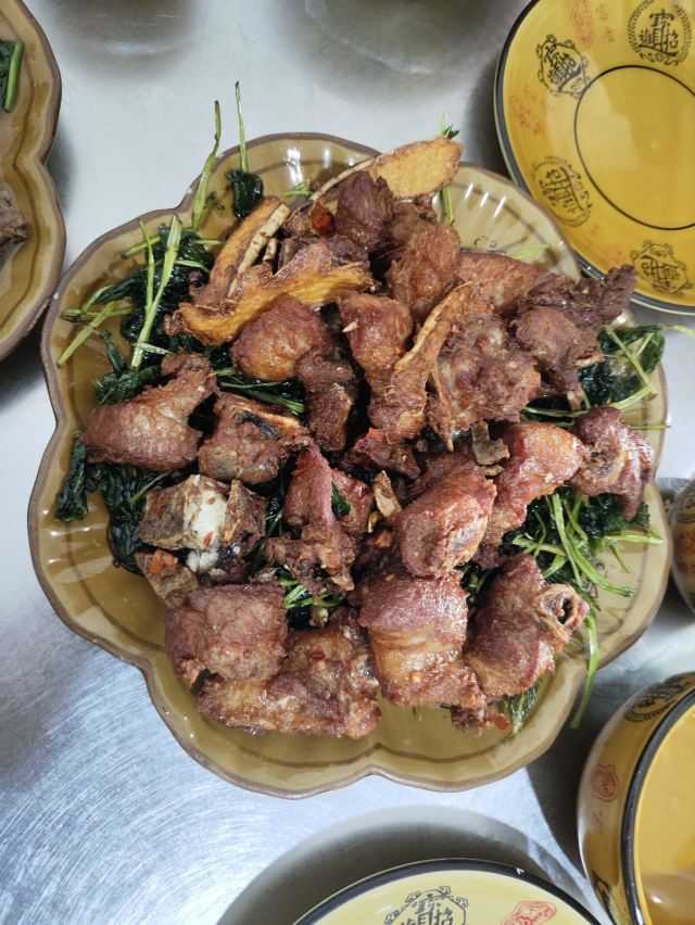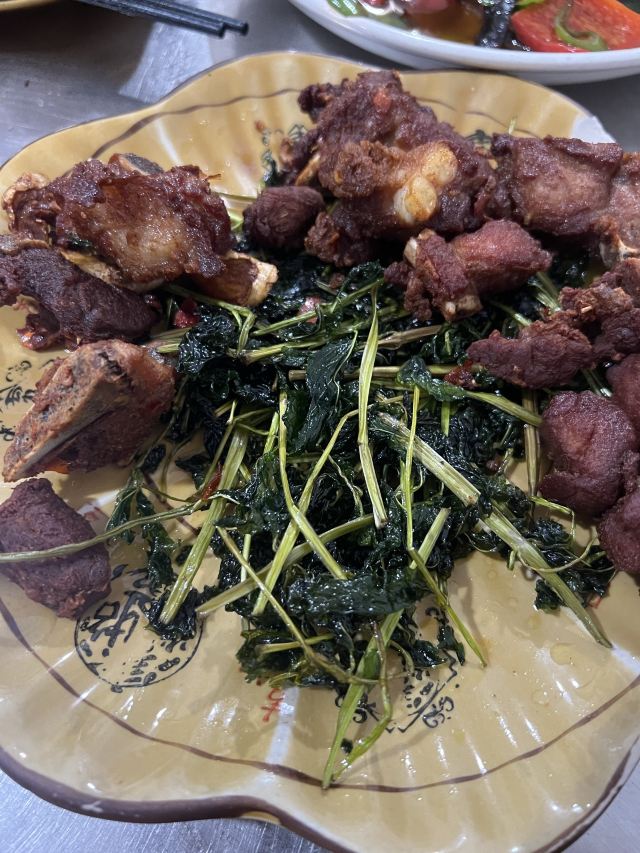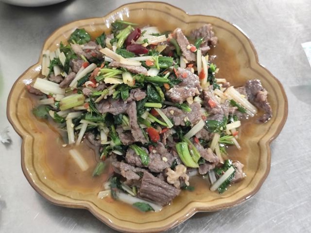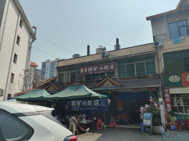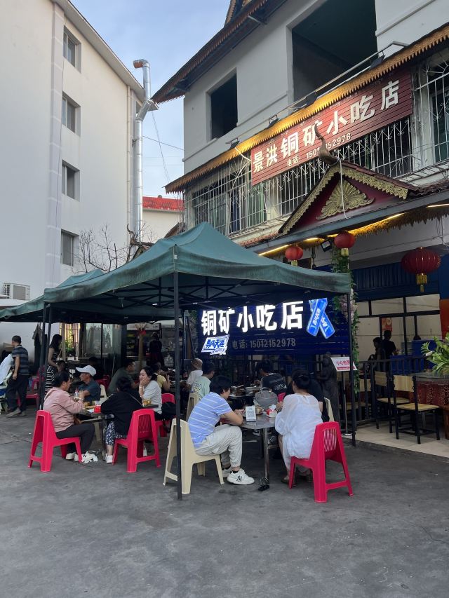 桃子妖妖妖从望天树景区返回西双版纳,中午吃点儿啥呢?景洪铜矿小吃店在网上人气很旺,人均四五十块钱,看起来还破破烂烂的,怎么就这么火了呢?我来看看咋回事。 据称他家是本地人都爱吃的地道小馆,到现场一看,嚯,果然是小苍蝇馆子,就是一个老旧小区的临街门市房,店面普通,装修简单,跟我们县城八九十年代的家常菜馆子差不多的样子,在这吃饭,有穿越的感觉。 用餐区是两间大大的屋子,十几张桌,门外还摆了一些露天桌椅,版纳的夏天有多热大家是知道的,就这条件还能吸引这么多人来吃饭,说明味道肯定是被大家认可的。有限的经营面积都给了客人,厨房只能放在门口的简易棚子下面了,现点现炒,锅气十足,在这吃饭,肯定是不用担心预制菜的问题了。屋子后门出去有个小院子,卫生间、洗手台都在院里,卫生状况可想而知,不是特别内急的,建议就别去了,专心干饭就好。 点了佐料牛肉、炒白花、腌菜鸡血汤,因为前两天在元阳吃的干炸排骨实在是太香了,又点了他家的炸排骨给小朋友吃。 先说味道。 佐料牛肉作为推荐最多的肉菜,名不虚传。这道菜是比较能代表云南菜特点的了,牛肉与各种香料完美融合,味道丰富又高级,牛肉鲜嫩爽滑,口感酸辣鲜香。配菜很多,我这种外地人只能吃出来有香菜、薄荷、小米辣、香茅草,其他的没法分辨,很好吃就是了。 白花是云南春夏季节常吃的野生花,做法也简单,焯水后简单翻炒即可,清爽好吃又健康。到了云南,这种花花草草的,我建议大家都体验一下。 腌菜鸡血汤就是为了调剂口味随便点的,味道不错,鸡血嫩滑,汤酸酸辣辣的很开胃。 排骨炸的很透,我喜欢这种干爽的口感,那种特别油腻的我根本就吃不了,薄荷叶子炸的也很脆,菜品好评。 服务很一般。之前吃的炸排骨是不辣的,没想到他家的放了辣椒,这个确实是我之前没想到没说,不能怪店家。端过来我就发现了这个问题,跟服务员和老板商量能不能先给点了这道菜的其他桌,等给我做个不辣的或者换个菜,根本没人理睬,最后吃了两口就打包了。店家的处理当然是没错,但如果能调换会更好一些。 菜品4分,环境、服务2分,是家很不错的家常馆子,但作为游客大老远的跑来吃还是很不值,更适合当地人自己吃吃。