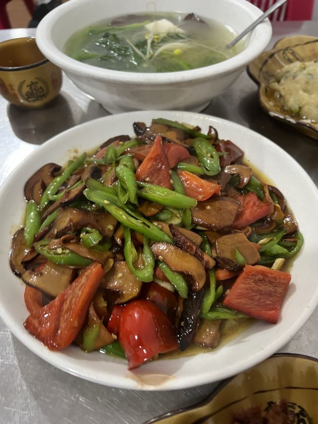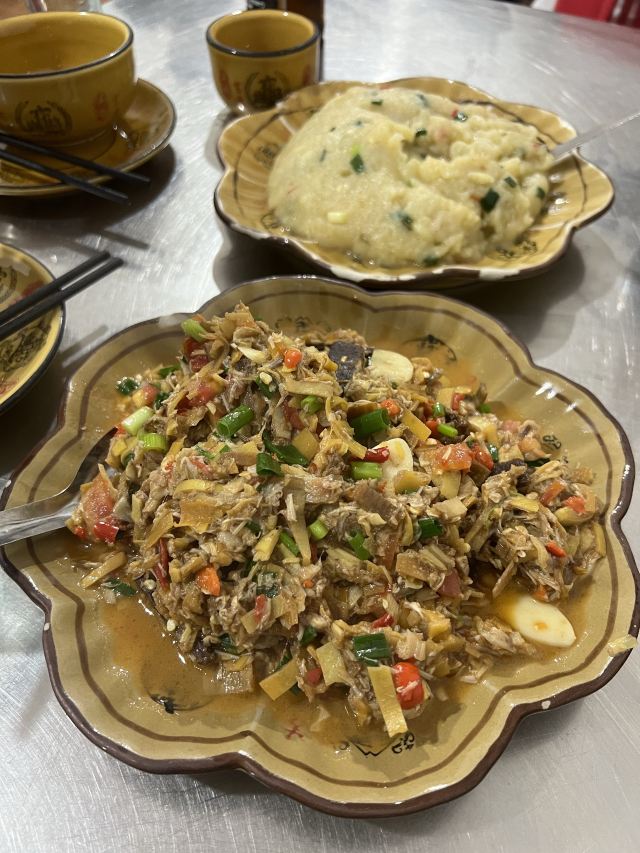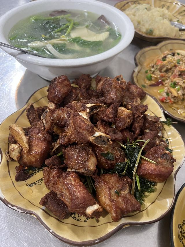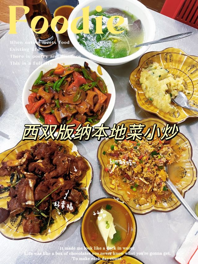 口味:西双版纳本地菜小炒,就是那种我想找的,本地人吃的家常菜。 毛奶洋芋15元,绵软好吃,咸咸的,中国家常版土豆泥,不怕油的人会很喜欢。 炸排骨38元,每桌必点,下面很多薄荷叶一起炸的,排骨量不少,虽然有点干,但是属于越嚼越香的下酒菜。 杂菜汤 15元,小份2-3人够,清淡爽口。 云南特色风味炒芭蕉花23元,今天我的最爱,里面加了豆豉条,特别咸香下饭。 版纳风味炒牛肝菌48元给的份量很多,脆脆的嫩嫩的,挺好吃的。版纳好像还是牛肝菌之乡。 环境:他家环境一般主要吃的就是味道,扫码自己点上菜也快,来了就是要体验下当地菜才有意思。