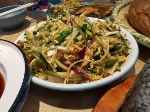 嘎牙鱼,江鲫鱼,果汁,小菜,笨鸡,排骨,胖头鱼,豆腐,宽粉,现蒸小花卷,鱼锅,大饼子,茄子,羊蝎子炖土豆