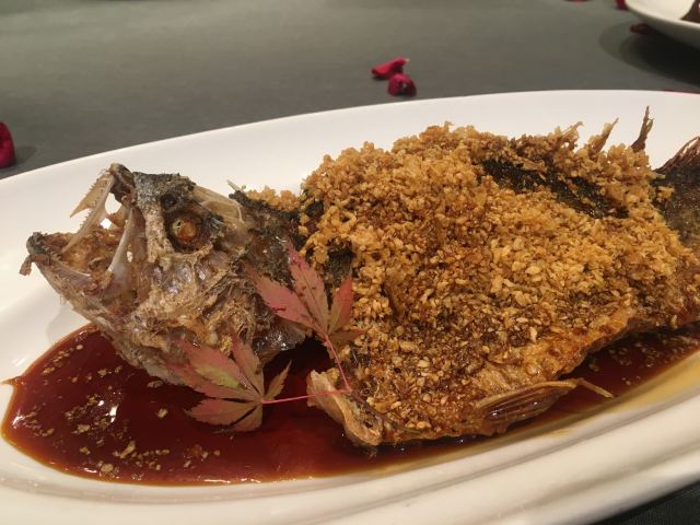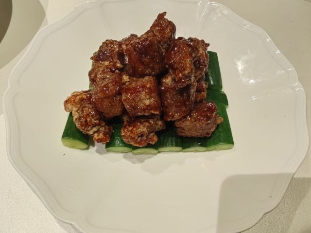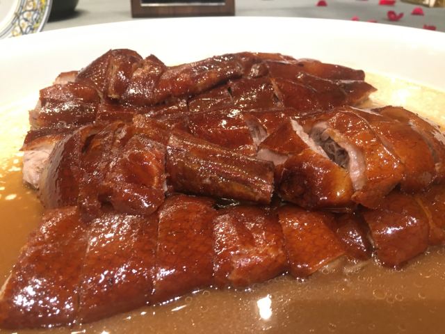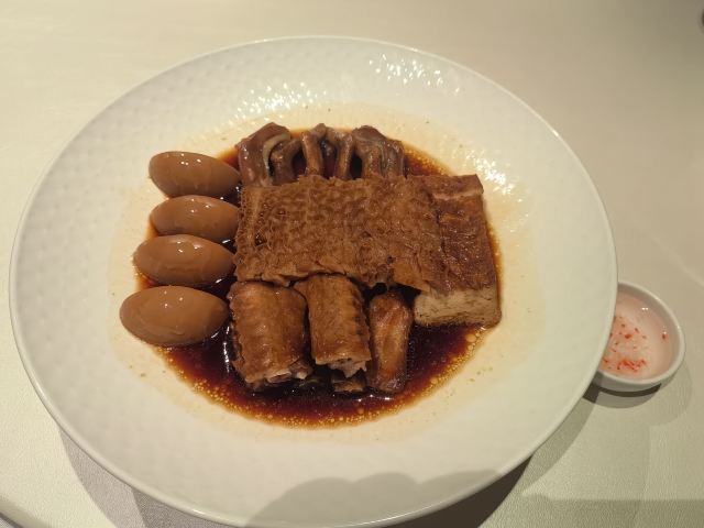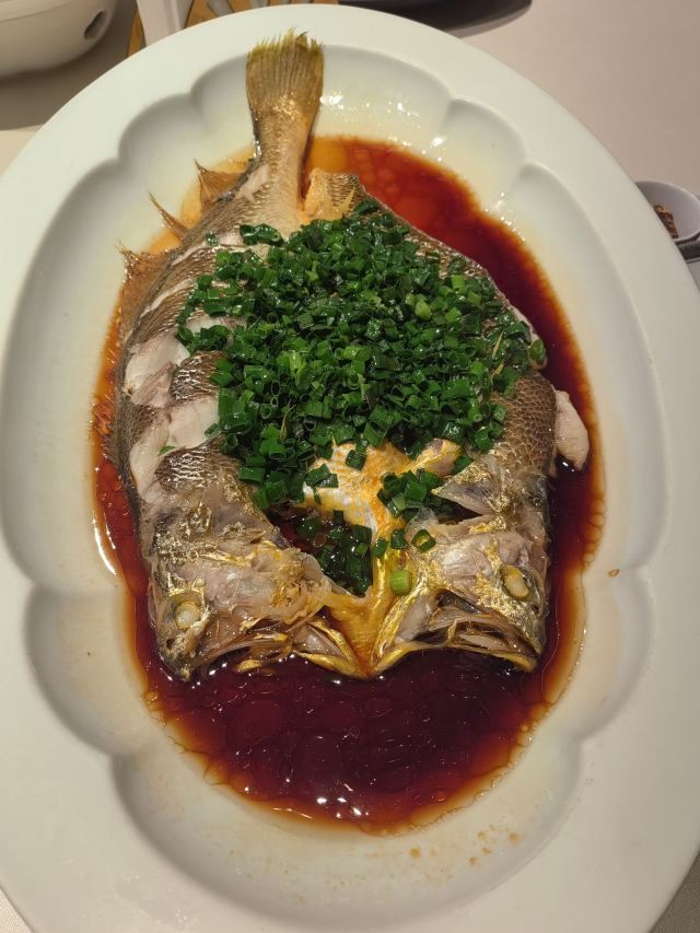 门口有免费停车场。就在红旗街和湖西路交汇处,交通很方便。 葱烧大黄鱼做的很漂亮,很大的一条鱼。 鲍鱼烧猪手,就是挠钱的。很大一盘子。颜色很漂亮。 牛肉粒火候掌握的很好,很嫩。 最赞玻璃脆皮乳鸽,非常鲜嫩多汁,真的是脆皮68也是值得的。 老母鸡汤好鲜,很大一份,用金属罐装的,保证汤一时半会都不会凉。 餐前的小食很赞,桃子果脯不很甜但是很有桃子味,花生酥脆。器皿都很精美。 桌布平整干净,服务热情。虽然今天人很多但还是不错的。