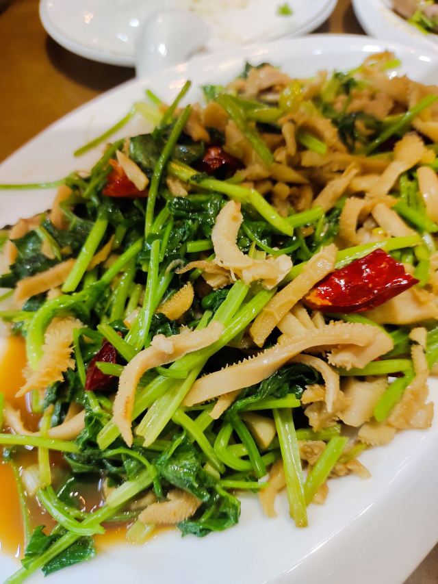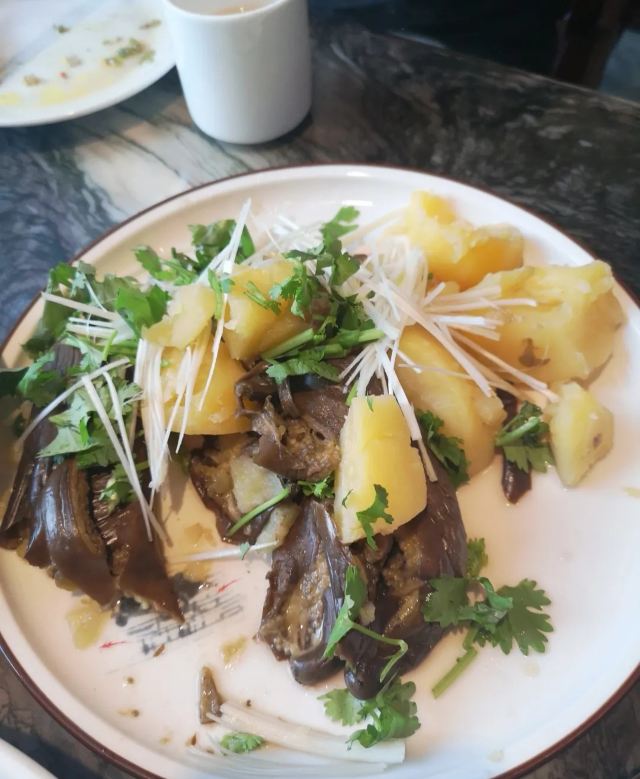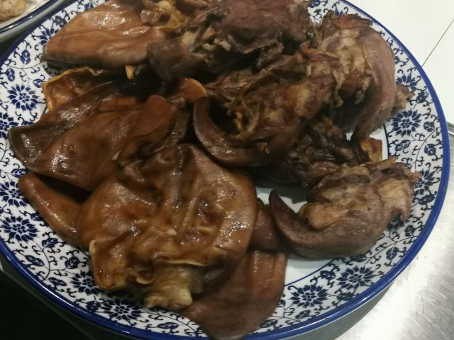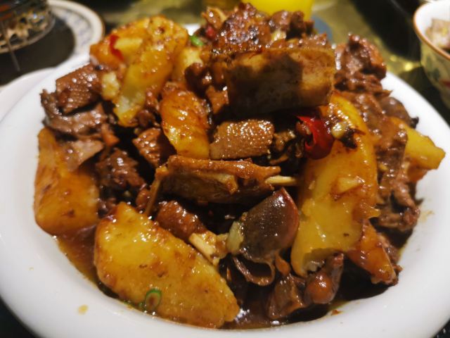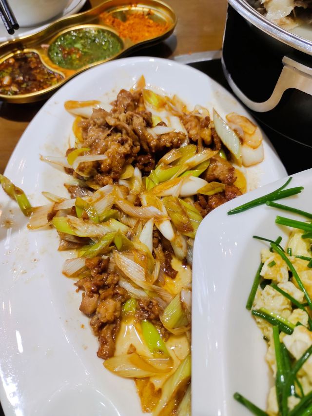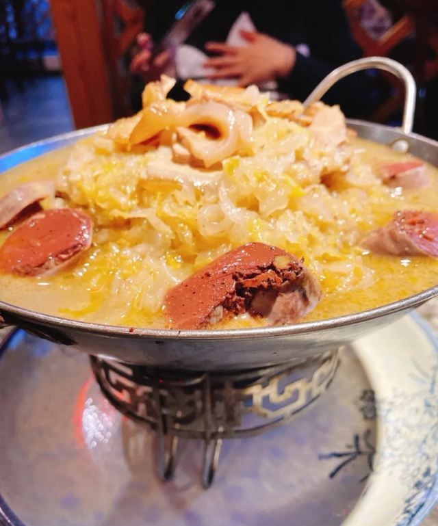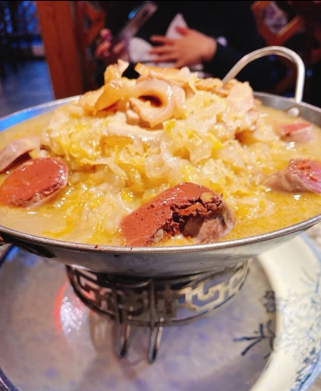 果真是名副其实的老店,不枉费我们跋山涉水的来探,虽然千山万水,不可缺少寻味的食客。坐落于东盛大街,上东街区外门市。 典型的东北风味餐厅,单看顶上的花布就觉得喜庆,分楼上楼下,我们错峰午餐,竟成了独一份的专场,自然是独享这东北风景啦。 锅包肉,爱死个人的锅包肉,甜咸适当,外皮酥脆,包裹着鲜嫩的肉,一口下去,全是满足感,多吃点,不要犹豫。 酸菜血肠五花肉,如果说粉条炖大肉不可不尝试,那么酸菜血肠五花肉岂不是得超出预期太多,五花大肉肥瘦相间,搭配酸菜去油腻,一口肉一口酸菜,血肠并不抢戏,反而三者合并并锦上添花。 自制皮冻。配上料碟,是下酒的好菜,自制皮冻劲道,爽滑弹牙,却也入口即化,回味无穷。 没有主食,实在吃不下了。人均才五十。