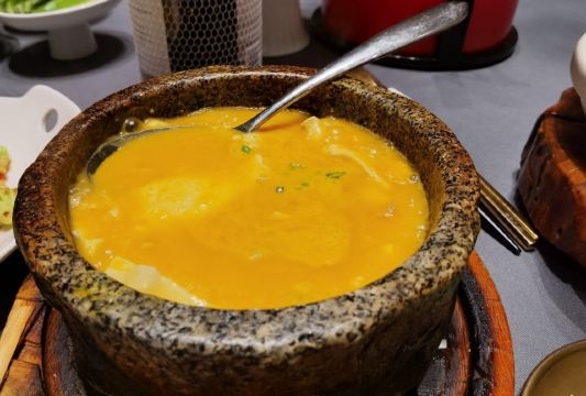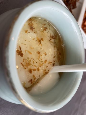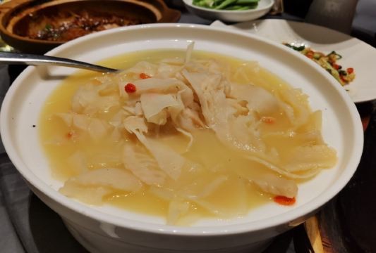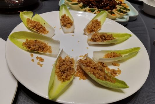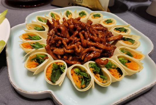 迪迪猫最近由于修地铁,门票很难找到停车位的,不过的后院还是有个免费停车场可以停车的。 酒店的环境很不错,就是供暖太好了,所以大家去的时候一定不要穿太多,真是热啊! |酥不腻烤鸭^他家的特色菜,一定要尝尝,做得很精致,有好几吃。一般烤鸭店的配料碟里都有白砂糖,他家放的是跳跳糖,还有好几种口味。烤鸭烤得中规中矩,味道上没有太出彩的地方。鸭胸的脆皮单独切成薄片,按照鹅肝的吃法,加上面包,配上店里自制的酱料,一口下去,酥脆多汁的感觉还是很不错的。玉兰叶鸭松以前没吃过,尝个鲜。鸭架汤熬的火候不错,咸淡也适中。 |芥末鸭掌^这是传统吃烤鸭的必点菜之一。 骨头剔的很干净,就是感觉辣劲儿不够。 |石锅肉汁芋头^味道还可以,只是五花肉片有些薄,芋头切得稍有些厚,这样肉汤的味道就没有完全被芋头吸收。 整体来看,他家上菜速度很快。菜品的口味还算不错,基本没有趟雷的菜。
