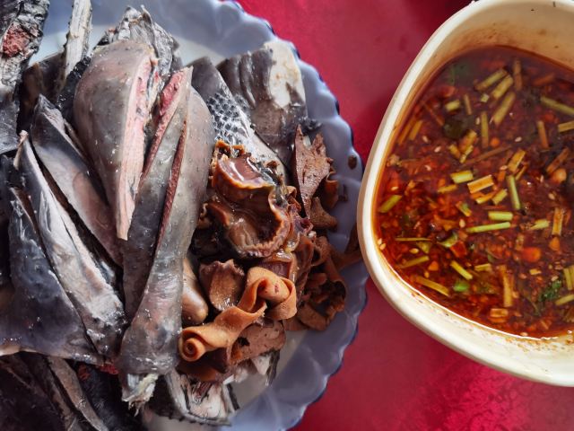 凉鸡,炸小鱼,烤乳猪,土豆泥,干巴