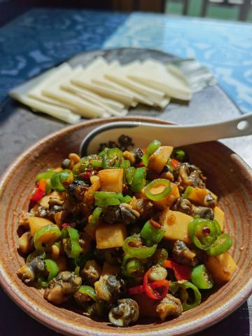 一个人的周末,在古镇闲逛,找间民宿小餐厅,凑合一顿,环境朴素,临河而坐,飞饼螺蛳肉,农民伯伯野菜,刀板香腌笃鲜,几个小菜,简单而不失美味。