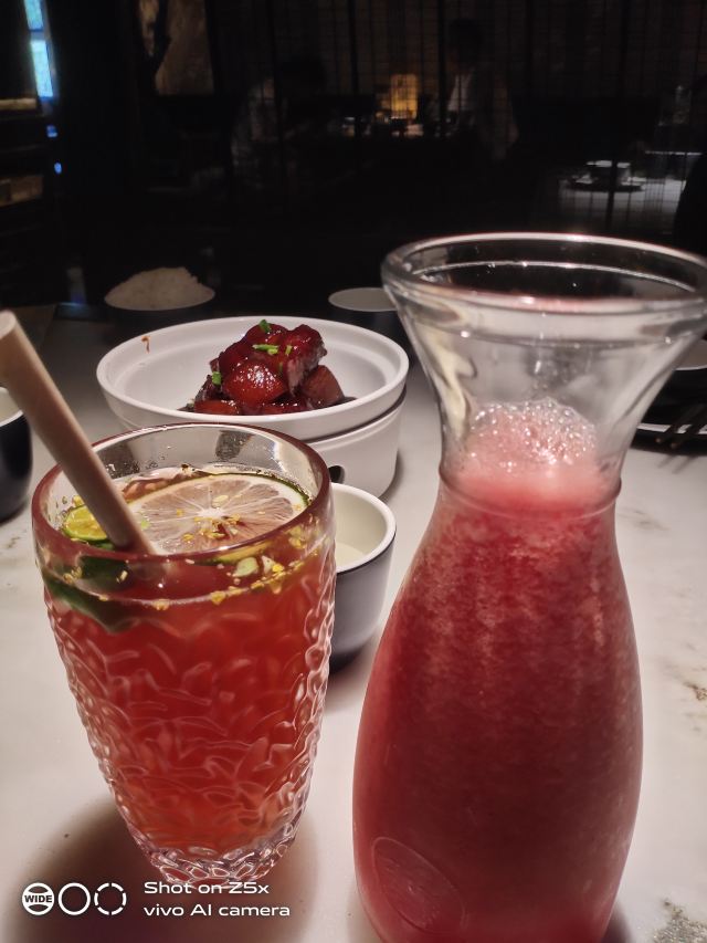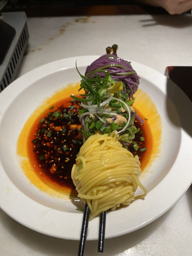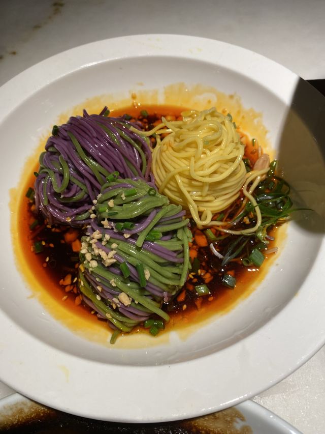 千岛湖银泰6层,过去都快2点了,人真心少,哈哈哈[呲牙] 环境很优雅,内部装修设计很有氛围感。 花生🥜冰沙,口感上有点咸咸的,但超级好吃😋 三色面很有意思,面条Q弹,酱汁入味,酸酸甜甜辣辣的,很是开胃。 鲜虾粉丝,端上桌后现制的,虾仁有嚼劲。