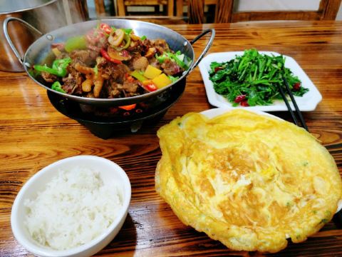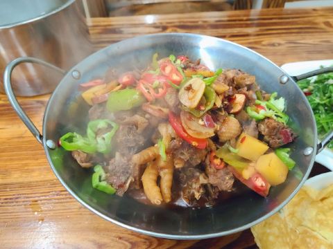 张家界非常的,特色湘菜店,湘菜比较出名的就是辣和麻,吃你的那个嘴巴简直受不了了哦,三下锅的配菜一般,就是鸡肉加五花肉,整体不错。还有这个摊煎饼好吃。