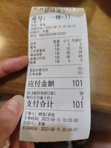 就。。。挺那啥的一家店。 住附近酒店,搜美食跳出来这家秒杀就买了,七点笃悠悠晃过去,到店晚上七点十分,让我去二楼一个有四张桌子的包间,可里面有桌四人各个抽烟,包房没窗那味道很呛,最后看见楼下大厅有桌刚走就坐那了,徐州和金华一样没有明文规定餐厅禁烟,大厅空间大会好很多。 入座去验秒杀券,说用不了鸡没了,我询问是不是可以换同价位或者我点个贵的付差价,都一口回绝。其实这在北上广深长沙南昌等地都可以操作并且有些餐厅还会因为套餐内餐品售罄而主动给几个选项让我选择。秒杀和团购是引流,你们天天几场秒杀挂着让人买,顾客买了被引过去,你们就要备足菜,七点出头就备菜不足让特意去的享受不到优惠又没有解决方案?要么就不要写不用预约而规定必须电话先咨询预约。后来退了秒杀买了代金券。 其次每个桌上都有打卡收藏送饮料的纸~有图有真相,写着收藏打卡呼叫服务员上饮料,我操作完了问服务员不知道,去收银台问叫我立马写评价,我拒绝了,没吃怎么写?收银员说规定就是写才送,我以为是我没看清,回桌上看仔细写的是用餐完毕如果觉得不错欢迎留下中肯评价,并不是硬性规定。我再去收银台说,她又改口说现在没有水果茶也没绵绵冰了,我说那怎么处理呢是送其他还是怎样?她说要问店长。过了会女店长拿着我点的烙饼来了说这个打卡收藏用不了,我说那我就白操作了呗,她说你可以取消呀,再说我们主要是要好评。。。我滴个娘,打卡怎么取消呀你教教我,如果一开始知道这么明目张胆要好评我肯定不弄的,妹妹在一边说,这家店不老实,哈哈哈,我说是啊,还没吃已经一肚子气了。讲实话这不就是明知道我不愿意写好评所以不给送打卡收藏的饮料嘛,不然一开始我去收银台叫我写评价干嘛?叫做我直来直往,碰到别人写一个拿到送的饮料反手删评再一个举报商户诱导写好评,你们知道会扣分屏蔽店铺得不偿失嘛?大众抓这个可紧了一举报抓一个准。 菜偏油偏咸,像下饭菜,配上饼或者米饭会好一些,我们点了饼和辣汤油条再吃这些菜好一些,但也是干掉两瓶600ml冰汽水。 讲道理这店口味70分有的,至少我觉得辣汤油条和烙饼包小炒肉还可以吃吃,清炒青番茄和我们去千岛湖旅游吃农家菜口感差不多,区别是油了点,最后没吃完旅游的也不方便打包,感觉点的这些三个人吃正好。