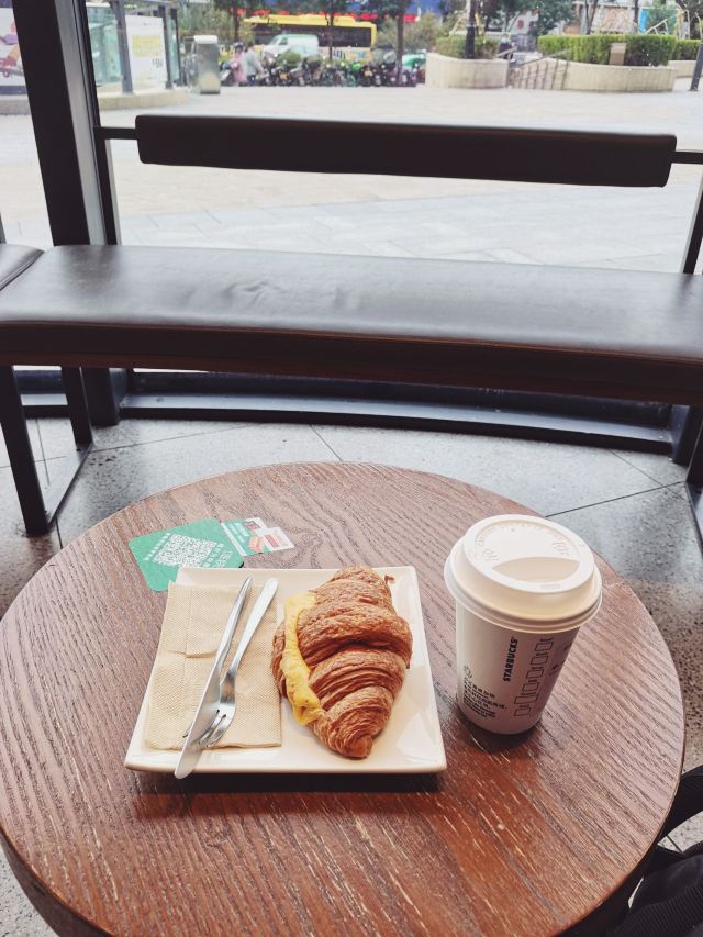 这家星巴克就在兰州中心的一楼,沿马路,点了一杯浓郁拿铁配一个夹奶酪肉片的可颂,让服务员帮忙加热一下,悠闲地消磨了一段时光,看看马路上人来人往。