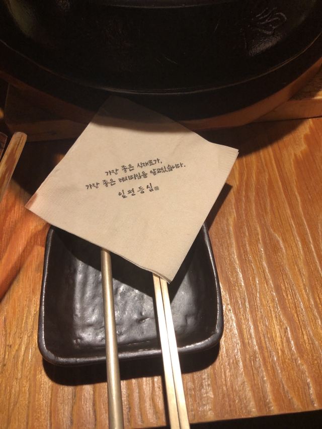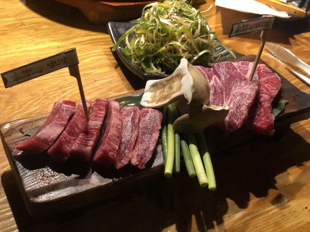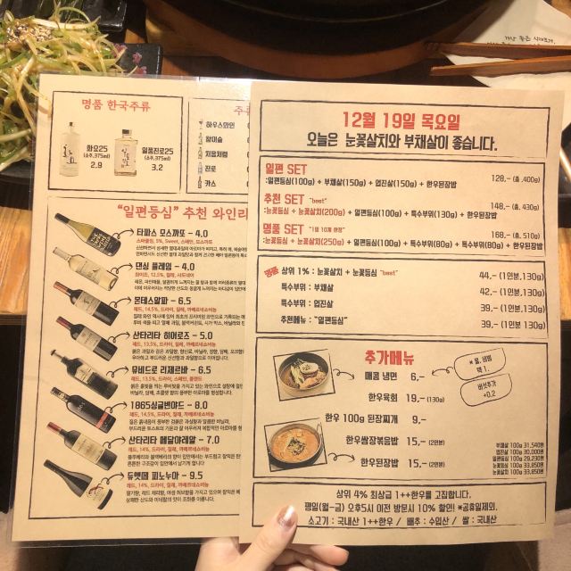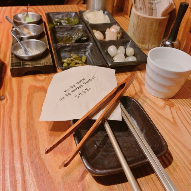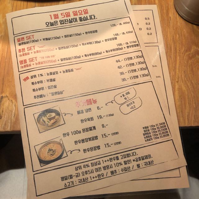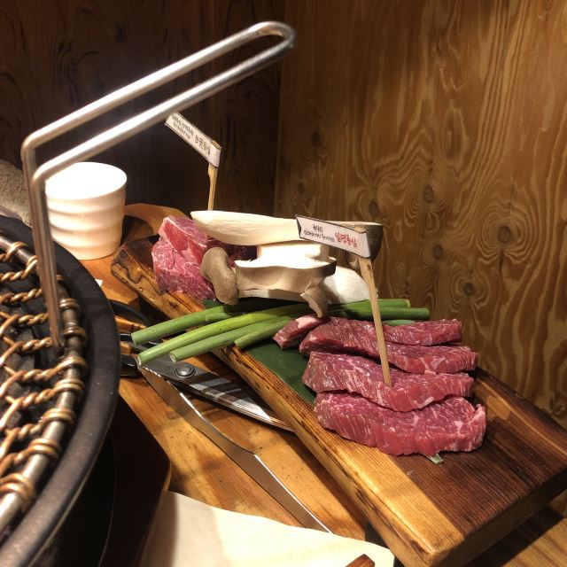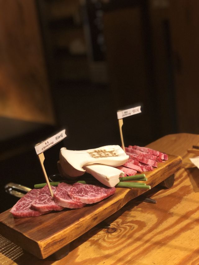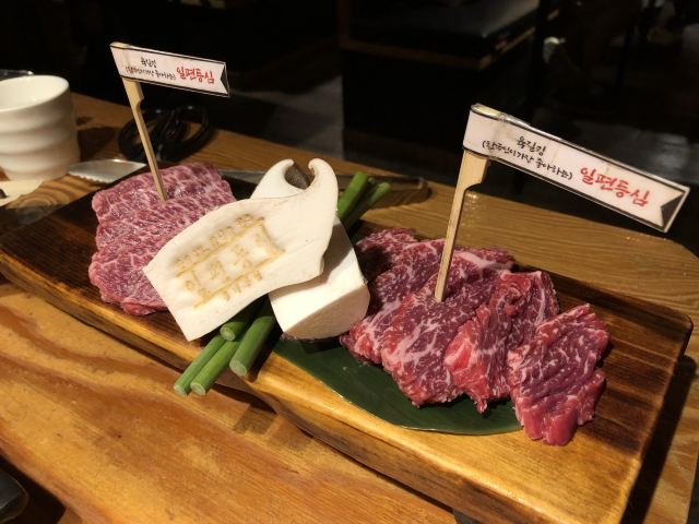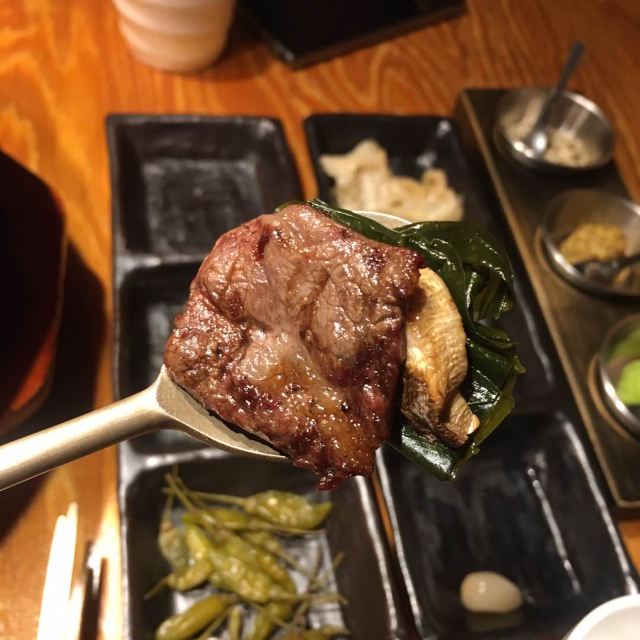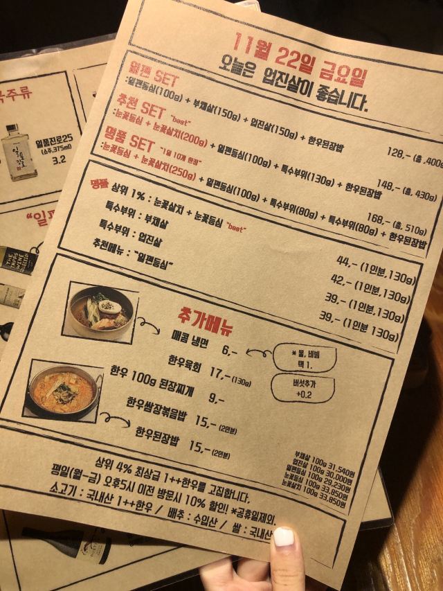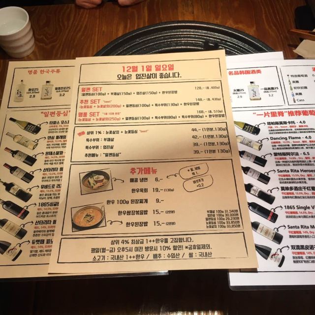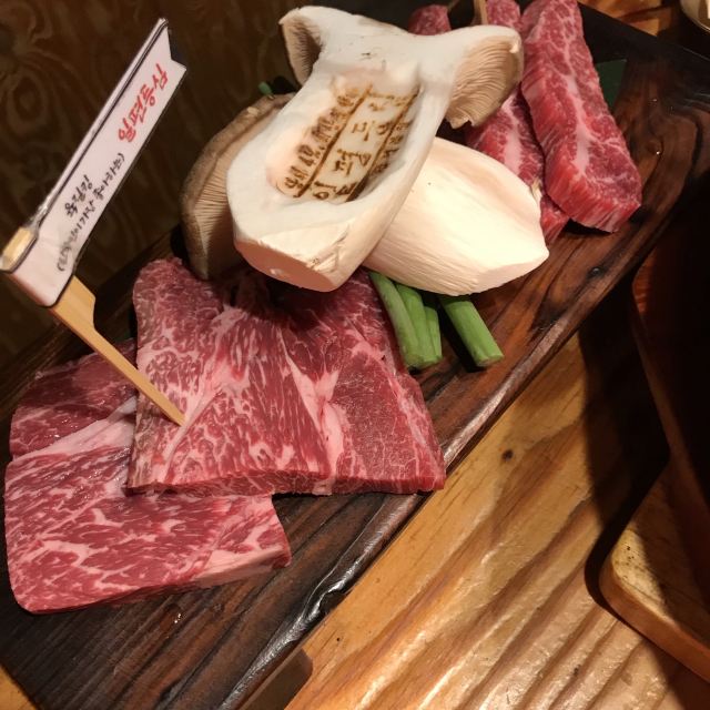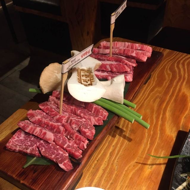 离弘大站很近隐藏的韩牛店 这家店的韩牛据说都是很新鲜的,门口有标韩牛进货的日期单,每天的厨师推荐菜单也都不一样。点了肉会有人帮忙烤,各种蘸料一应俱全。环境也很不错,不踩雷的餐厅~ 不知道吃什么可以来尝尝韩牛~