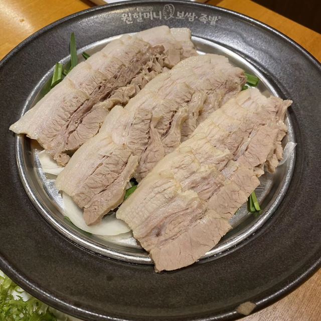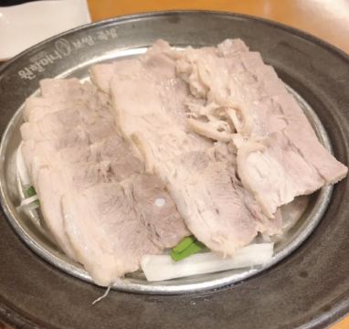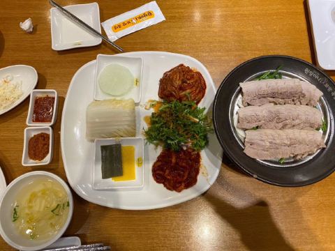小侄女来首尔玩 作为美食达人的我一定要带她吃遍弘大美食 今天选的是 元祖奶奶菜包肉 这是一家有45年传统的连锁店 肥瘦相间的水煮五花肉切好摆盘 搭配水萝卜 泡菜 沙拉 萝卜干泡菜 年糕 根据自己口味来调配 个人比较喜欢吃水萝卜包肉 搭配虾酱,大酱 沙拉 泡菜一起 肉入口的时候肥而不腻 嚼起来唇齿飘香 真的是好美味 送的豆芽汤清淡爽口, 喝完还可以续哦 搭配一起吃感觉肉都能多吃几块 两个人点一小份就吃得饱饱的 非常的划算呢