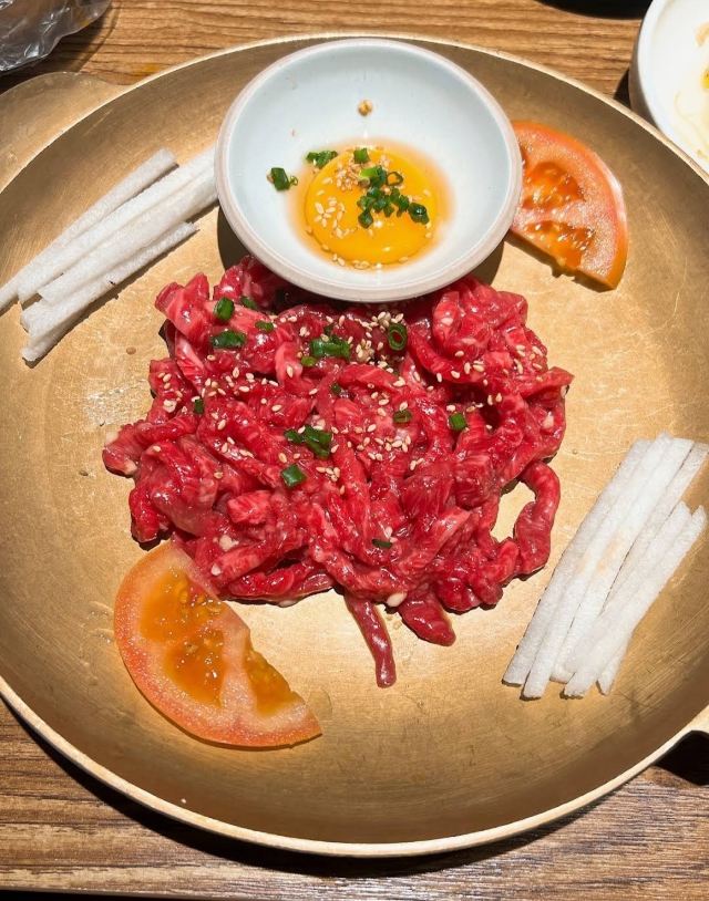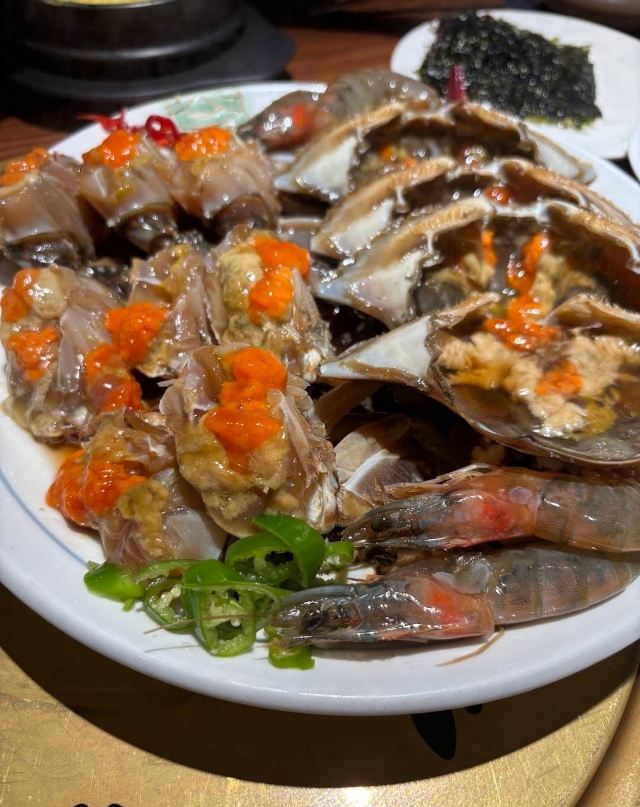 韩式原酱油蟹,生拌牛肉,烤牛舌,鲍鱼粥,豆腐汤,海鲜葱饼,烤猪排,烤牛五花肉,烤牛排,酱虾,没有,泡菜,韩式拌饭,韩国烤肉,酱蟹,鲍鱼,酱油蟹虾双拼+烧酒