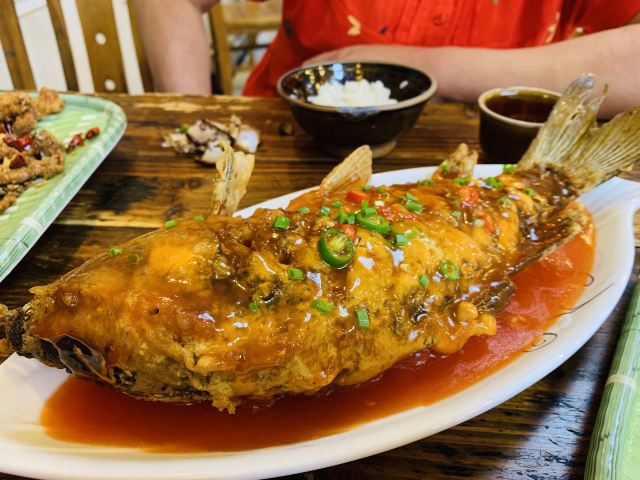 强烈推荐的一家餐馆,价廉物美,菜品的味道真心赞,游客很少,当地人去吃的多。我们点了三个菜:辣子鸡、竹笋炒腊肉、糖醋鱼,都很美味!餐馆位置比较难找,在一条很窄的巷子里,但是真心值得去吃。