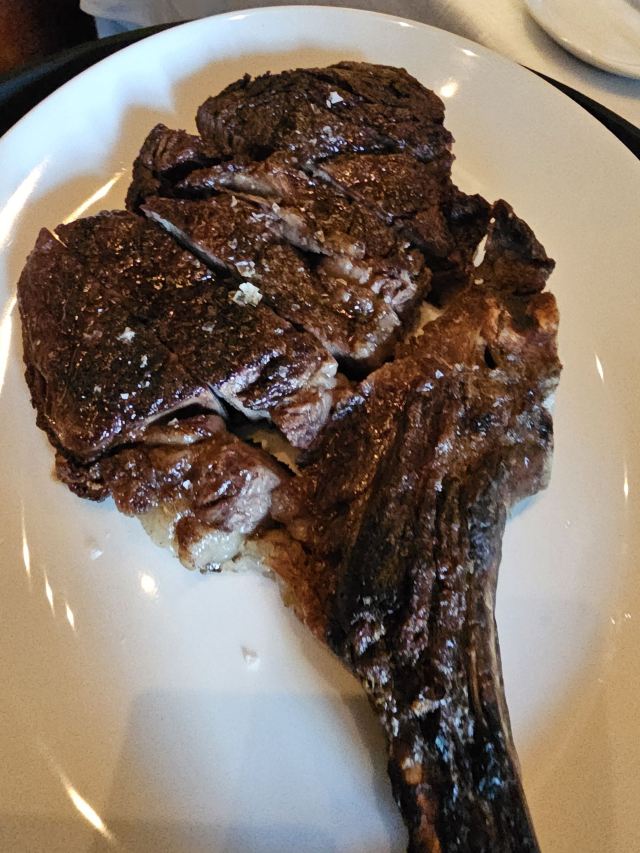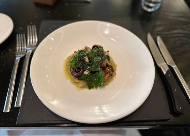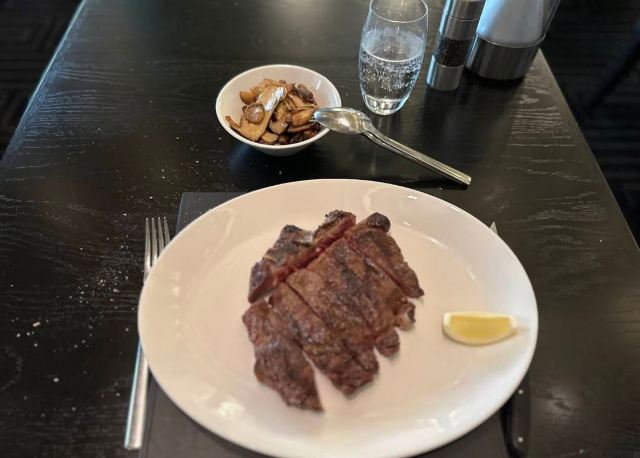 餐厅之名气响亮不提,但是光墙面拿得奖牌也是惊人之多。我点了「烤章鱼、茄子泥佐阿根廷青酱」,章鱼处理的恰到好处,仍留着炭火的余温与焦香,搭配着茄子泥爽口讨喜,最后阿根廷青酱画龙点睛似的。「干式熟成56天、带骨肋眼牛排」让我品尝到近期最无懈可击的「熟。成。牛。排」,鲜嫩多汁这种还不足以形容,让我讶异的是连肉里面的筋与油都与肉相揉合,不需盐花提味仍有风味展现,提供不同产地的芥末搭配可以品尝到多层次的风味。