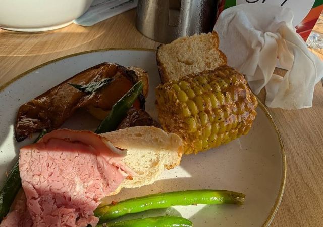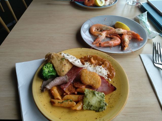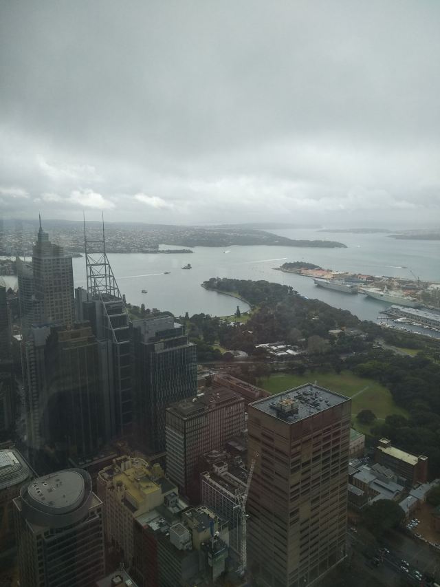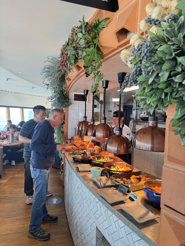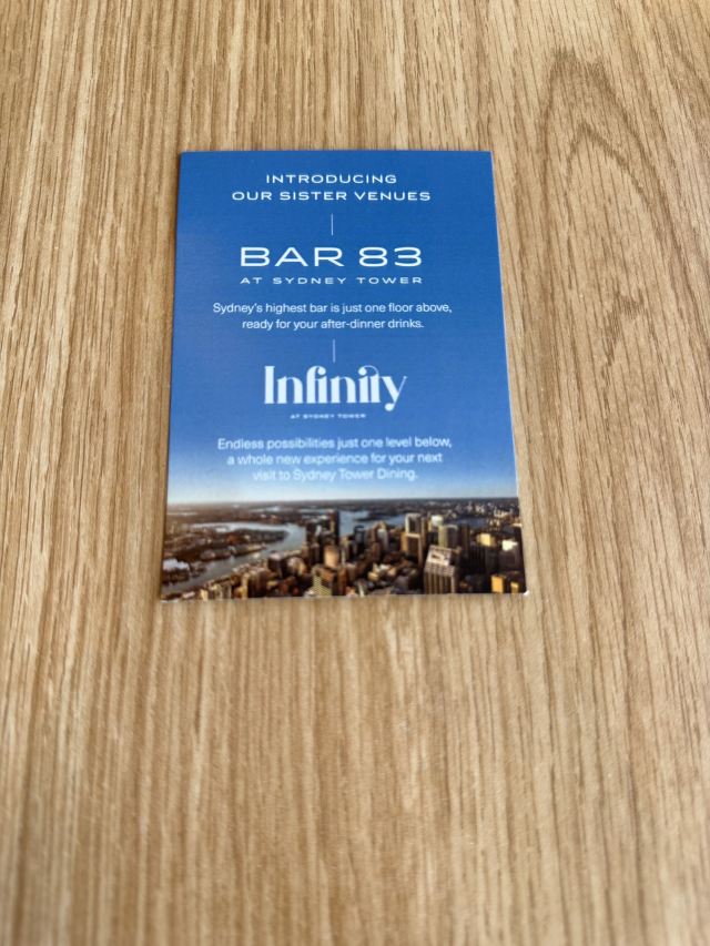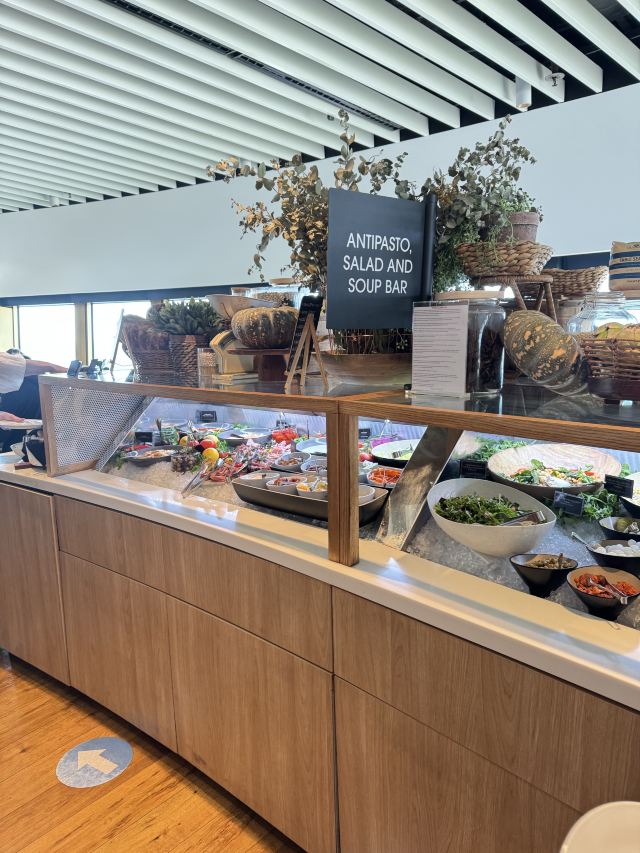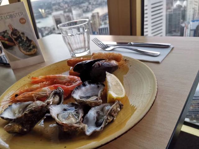 梅子SD算是到悉尼必打卡之地吧。当地朋友请客过来吃的,但是真的是价格不菲,真的有些心疼呢。 排队直梯,直达餐厅。两部直梯各有一个屏幕,可以同时看到另一部电梯里面的人,我们互相激动的打招呼,感觉挺棒的。进入餐厅,引位坐好,后可以取餐,用餐时间是有规定的,不可以太久。取完餐后,就可以一边欣赏悉尼全景,一边享受美味佳肴啦!