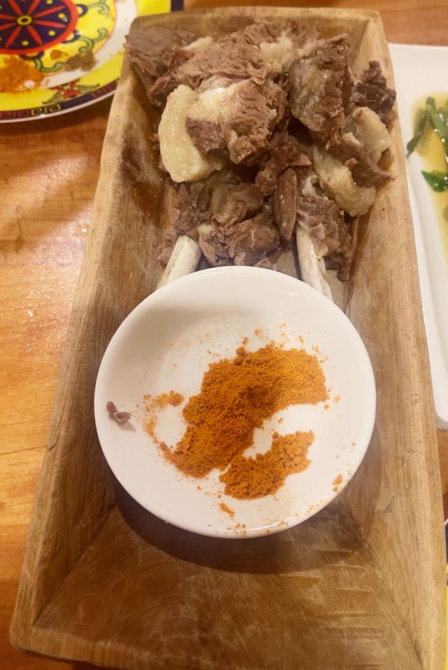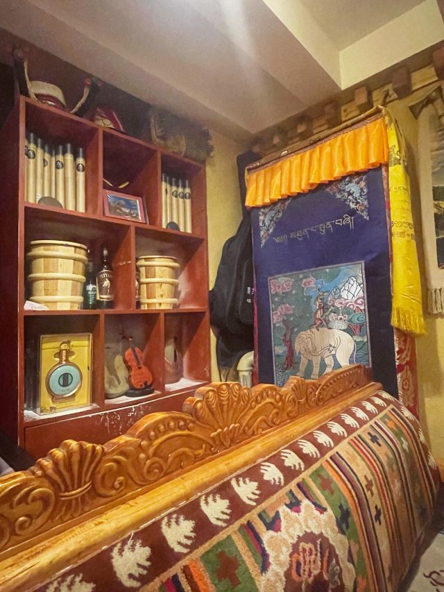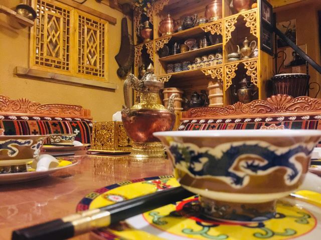 这家私房菜馆就在力盟步行街的一栋居民楼里,虽然地方难找了一点,但正宗的藏式口味还是吸引了不少食客前往。老板是一位藏族文艺大叔,从各个包间的铜壶、顶灯、龙头琴、书架、佛龛等摆设,你可以感受到浓浓的藏族氛围。牦牛肉、烤蘑菇、安多包子、酥油茶、酸奶等菜品都是独到的手艺,推荐一试。