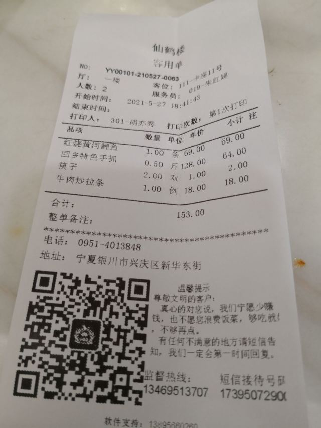 此刻安静🤫去年晚上12点左右到的宁夏,找了一下仙鹤楼还开着 【口味】宁夏当地特色,羊肉牛肉好吃的很 【环境】老字号品牌,很有特色 【服务】服务态度还不错,毕竟很晚过去吃,就我们一桌客人