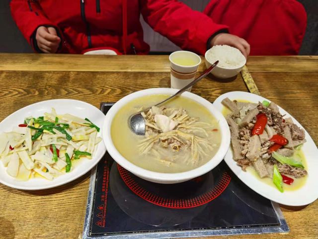 东坡肘子,雪魔芋烧排骨,雪魔芋烧土鸭,冬菜粉丝汤,豆瓣鱼,蕃茄炒蛋,炝白菜,高山老腊肉,干妈回锅肉,干笋烧牛肉