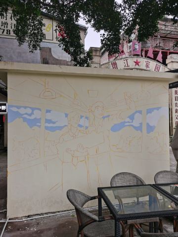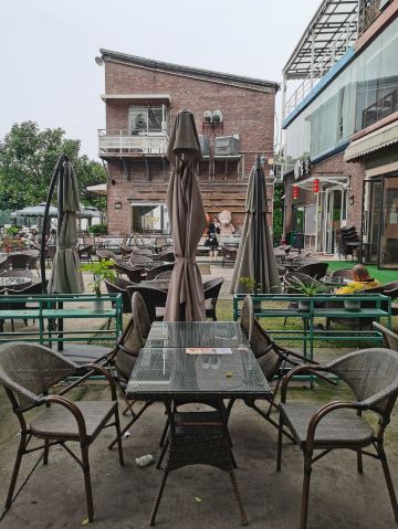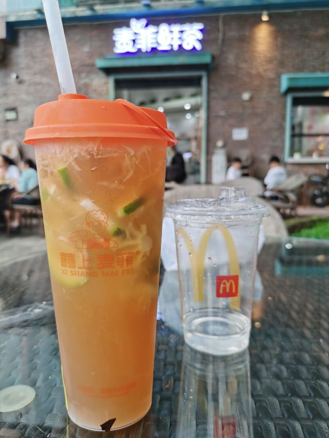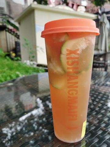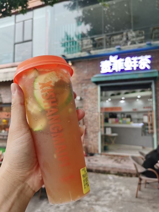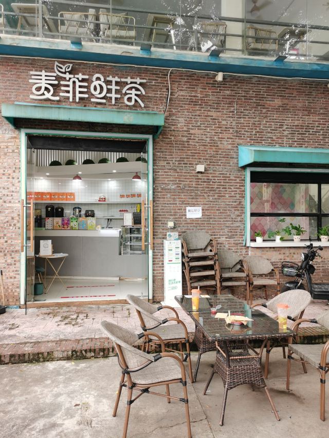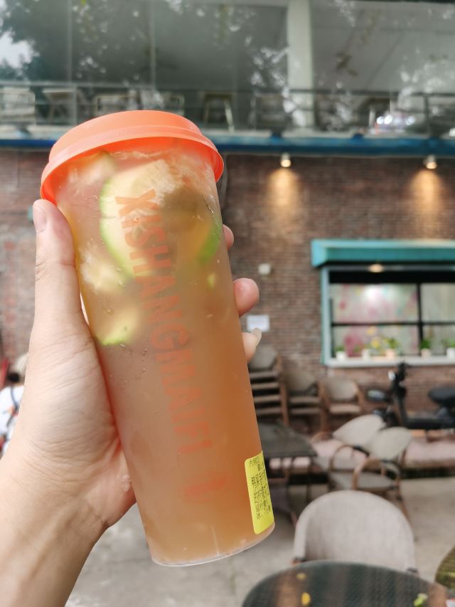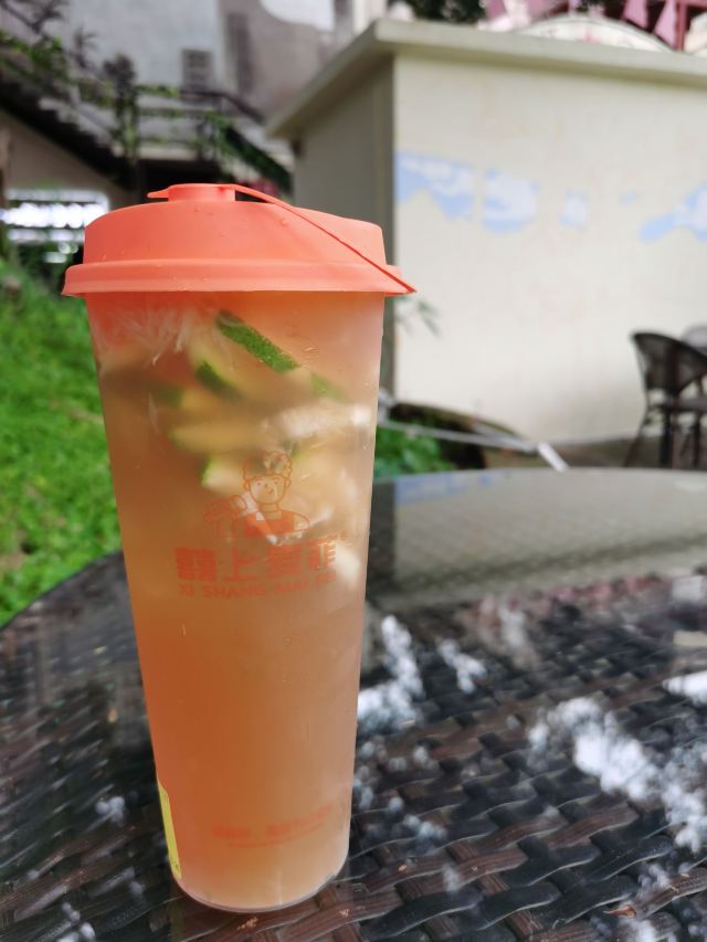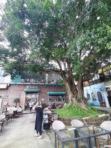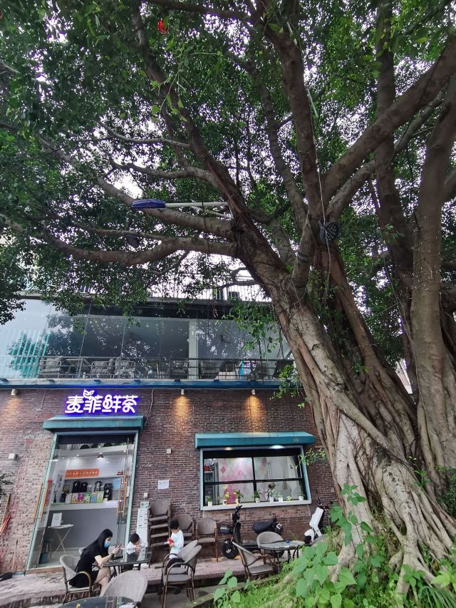 在这片充满创意跟电影艺术的园区里面,有一棵超大的榕树,在这下面有一家水果鲜茶店,这边还是挺容易找的,周边都是喝东西的店铺聚集在一块。