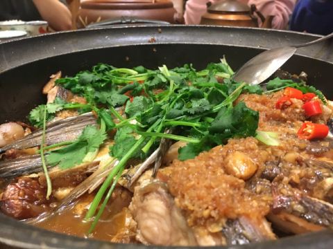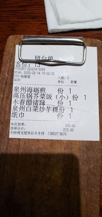 YoYo_2E1H6F3N在开元盛世广场商场里面,3楼海底捞隔壁。装修有着浓浓的闽南风格,整体看上去很敞亮,不会给人很压抑的感觉。 雨花石锅牛肉: 之前在万达那家食锦记吃过,一直很喜欢这道菜。端上来热气腾腾,牛肉很嫩,加了黑胡椒,味道不错。 芹菜鲨鱼羹: 鱼肉很嫩,鱼羹没有刺,芹菜裹了淀粉先蒸一下,再下去煮汤,这样芹菜吃起来不烂,口感极佳。 老坛姜母鸭: 闻起来很香,鸭肉嫩。和厦门的做法不太一样,不过我还是喜欢这里的做法,厦门的姜母鸭吃起来太油腻。 汽锅鸡: 汤汁由蒸汽凝成,最大限度保留了鸡肉的鲜美,鸡肉很嫩,不会柴,汤也不错。 安海菜粿醋肉拼: 菜粿外酥里嫩,口感不错。醋肉嫩,搭配甜辣酱。 葱蒜姜焗水库鱼头: 鱼头很大,鱼肉多,加了配料小米椒,蒜末,感觉不辣。 萝卜饭: 闽南的咸饭,加了以红萝卜为主,还有香菇,花生,三层肉。米饭软硬适中,符合我的口味。 服务不错,进包厢先打招呼,上菜速度快。