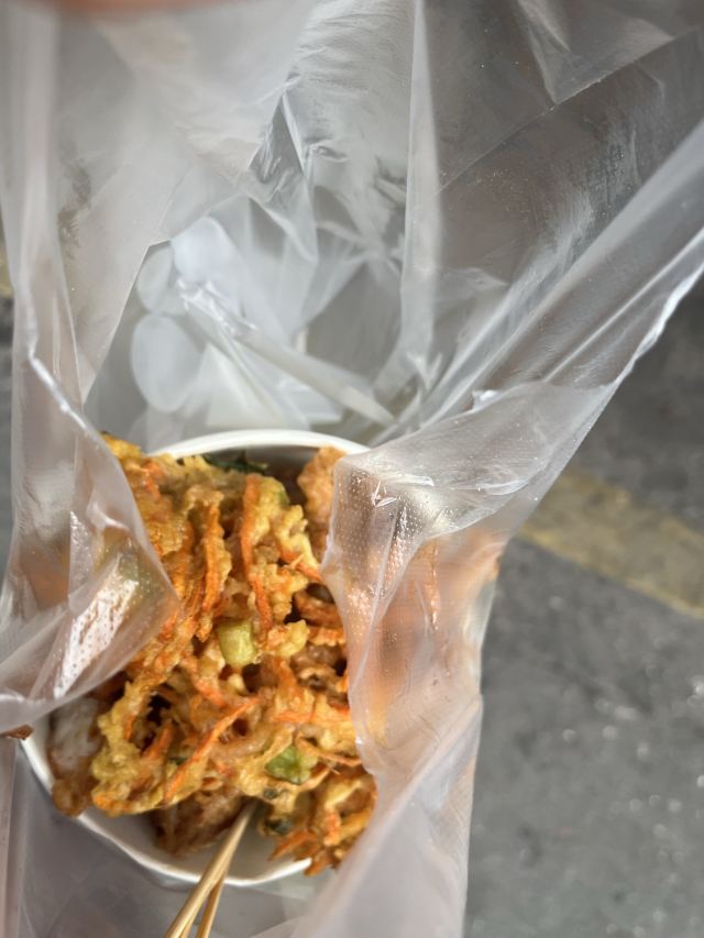 旅游度假本来是冲着国仔面线去的,大年初二刚开门,排队长的不得了,懒得排队,看到门口这家炸物店排队人少,赶紧选了些东西买单。老板娘给盒子,自己挑,我买了鸡腿,鱼,一个什么卷,然后还有蔬菜饼,一块排骨,总共27块,当早饭吃了。太饱了~